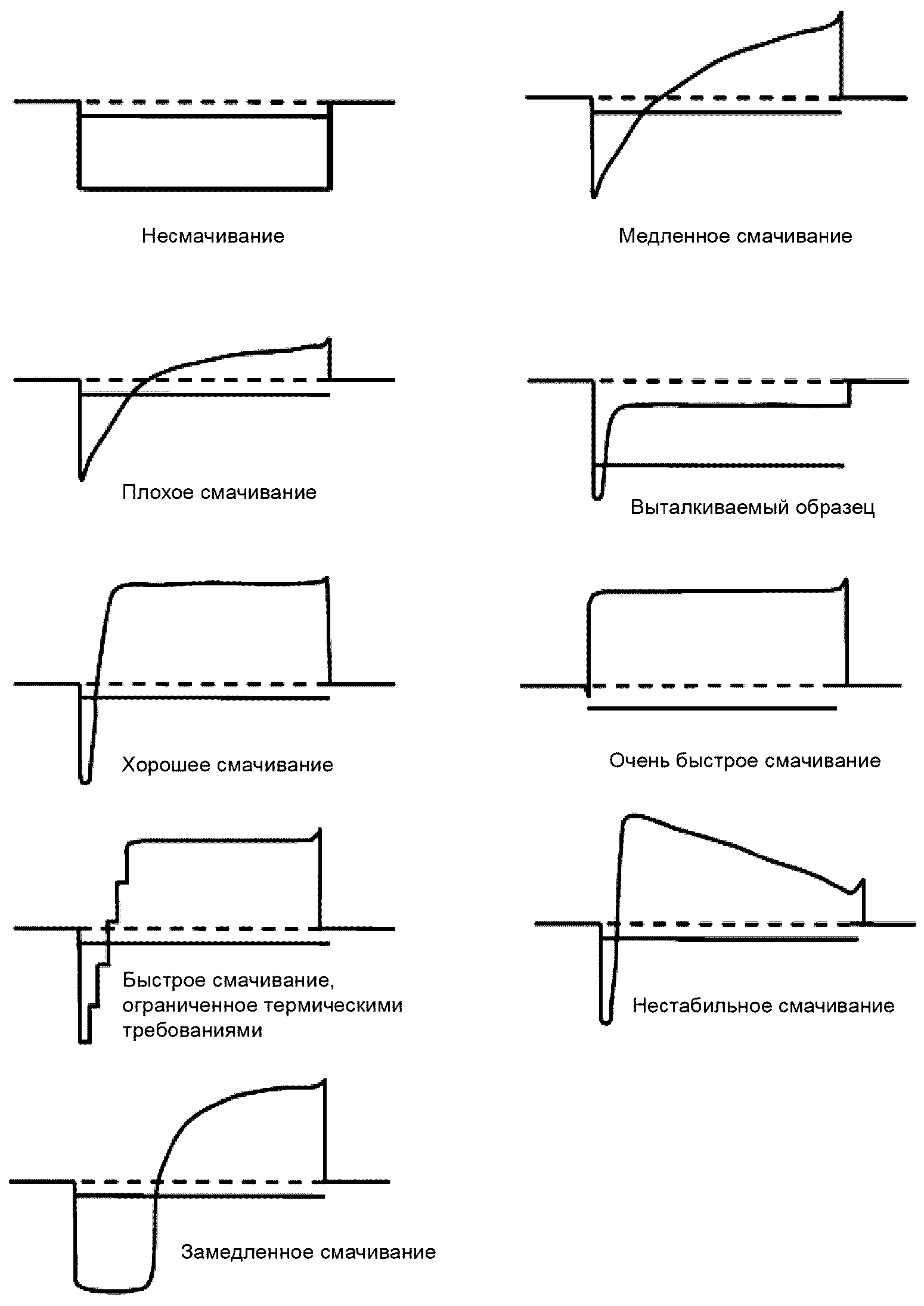 В приведенных ниже примерах часть кривой, характеризующая выталкивающие силы, действующие на образец снизу вверх, т.е. состояние несмачивания, обозначена как отрицательная; кривая, представляющая силы, действующие вниз, т.е. смачивание, показана как положительная.