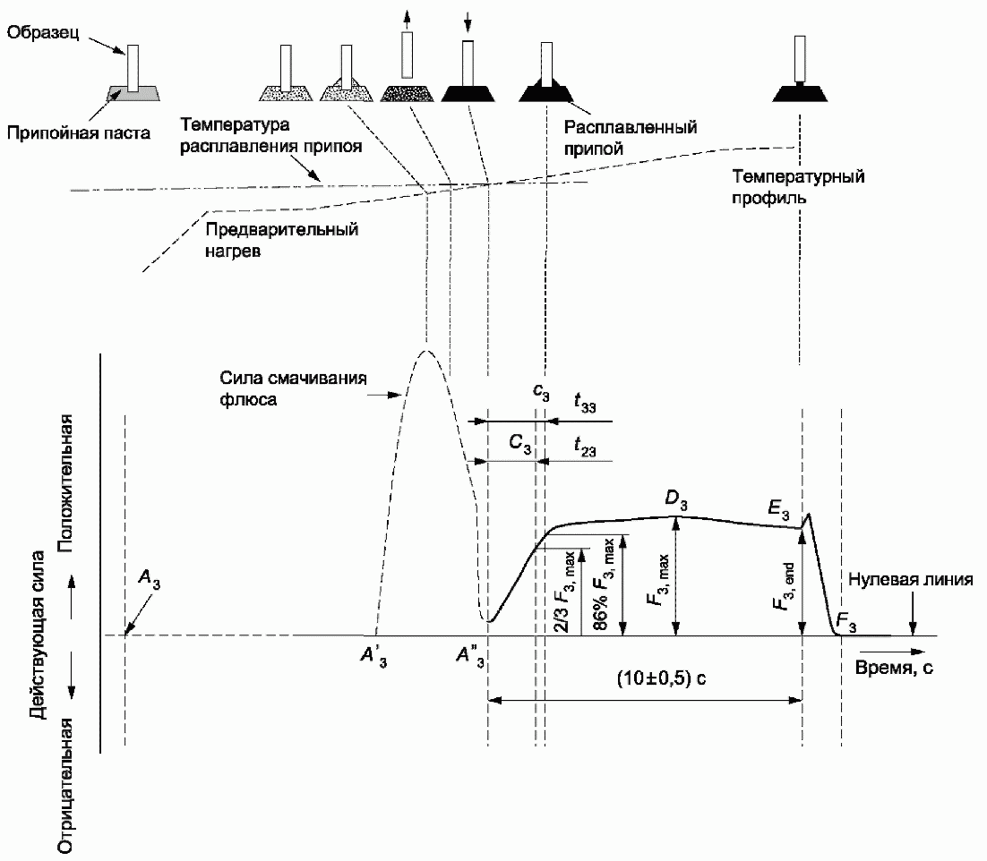 b) Синхронный метод. Смачиваемость электродов компонента оценивается, пока припойная паста расплавлена при быстром повышении температуры. Образец погружается в припойную пасту тогда, когда начинает повышаться температура.