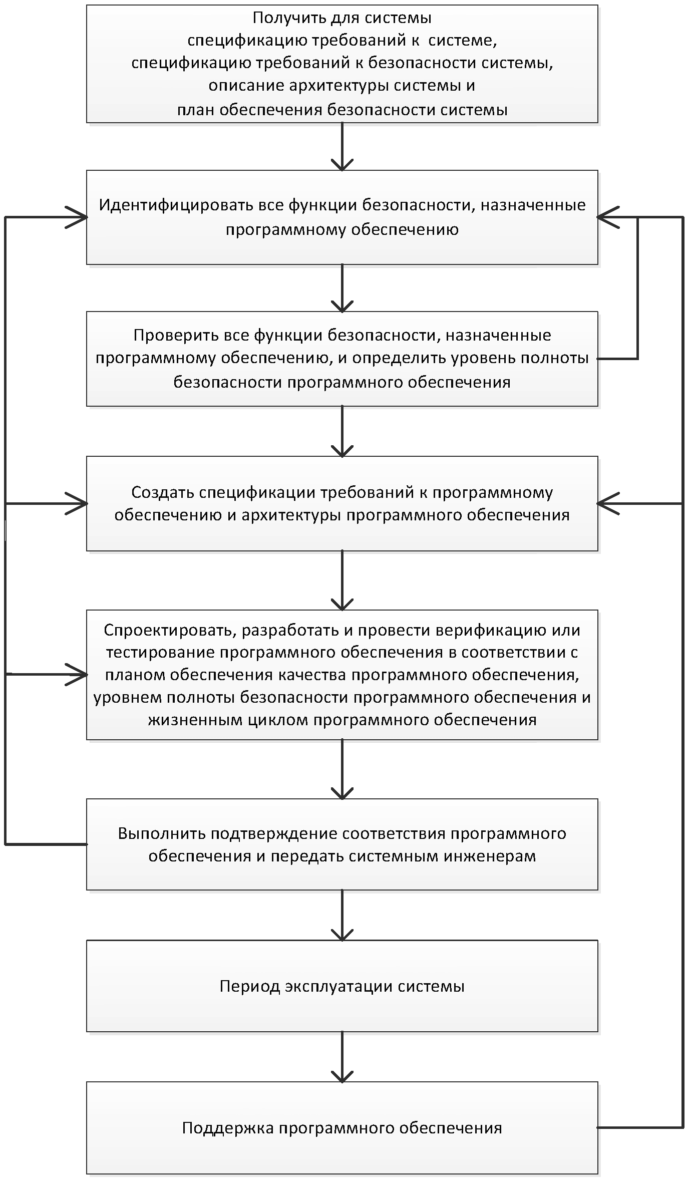 Поскольку проект декомпозируется и формируется спецификация для отдельных связанных с безопасностью систем и их компонентов, то для них далее выполняется определение уровней полноты безопасности. В конечном счете, это приводит к требуемым уровням полноты безопасности для программного обеспечения.