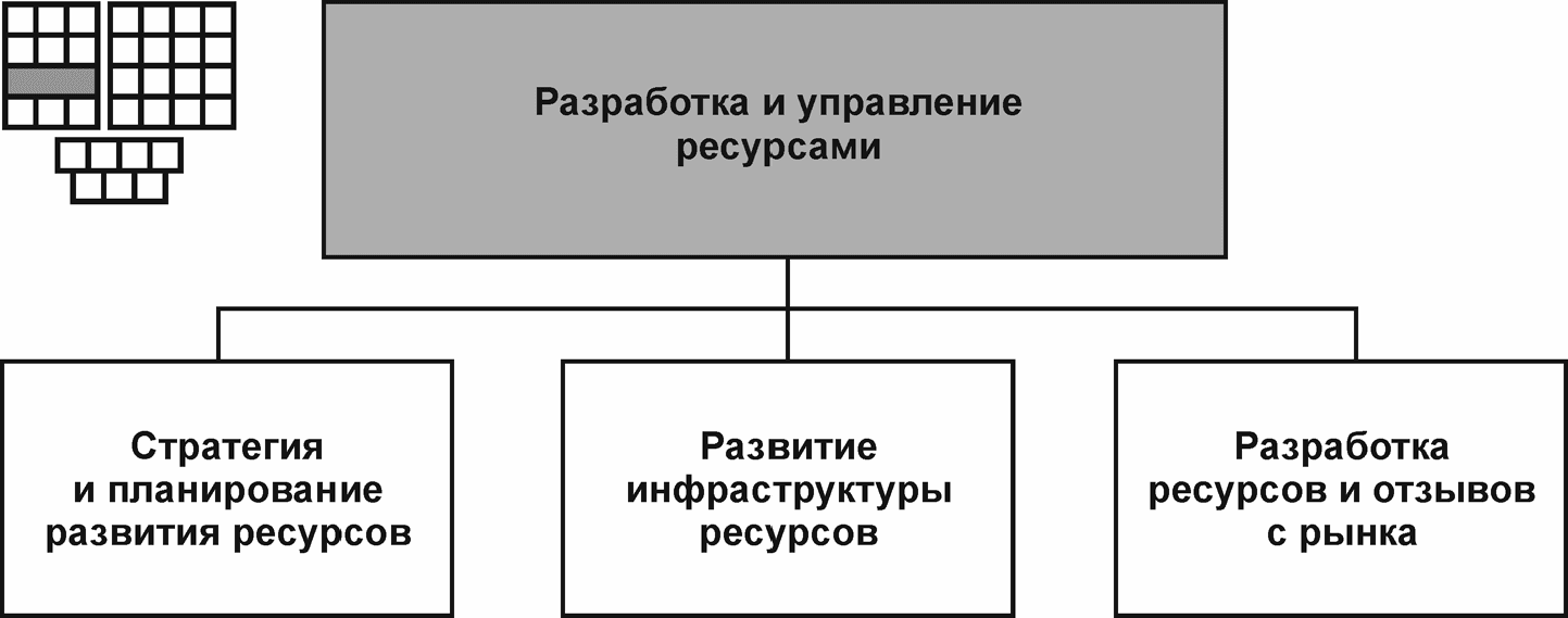 1.2.3.3 | Разработка ресурсов и отзыв с рынка (Resource development and retirement) | Процессы разработки новых или совершенствования существующих технологий и сопутствующих типов ресурсов. Цель процессов состоит в обеспечении доступности на рынке новых продуктов. Процессы выполняются в соответствии со спецификациями инфраструктуры или с требованиями к ресурсам, которые подготовлены процессами разработки стратегии и планирования развития ресурсов. Процессы вывода из эксплуатации устаревших технологий и сопутствующих типов ресурсов. Процессы заключения соглашений с поставщиками/партнерами об уровне участия в создании сети на базе установки ресурсов или с использованием аренды ресурсов определенных типов |