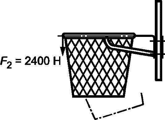 К середине щита баскетбольного оборудования всех типов прикладывают сосредоточенную вертикальную нагрузку (3200 +/- 50) Н в течение (65 +/- 5) с.