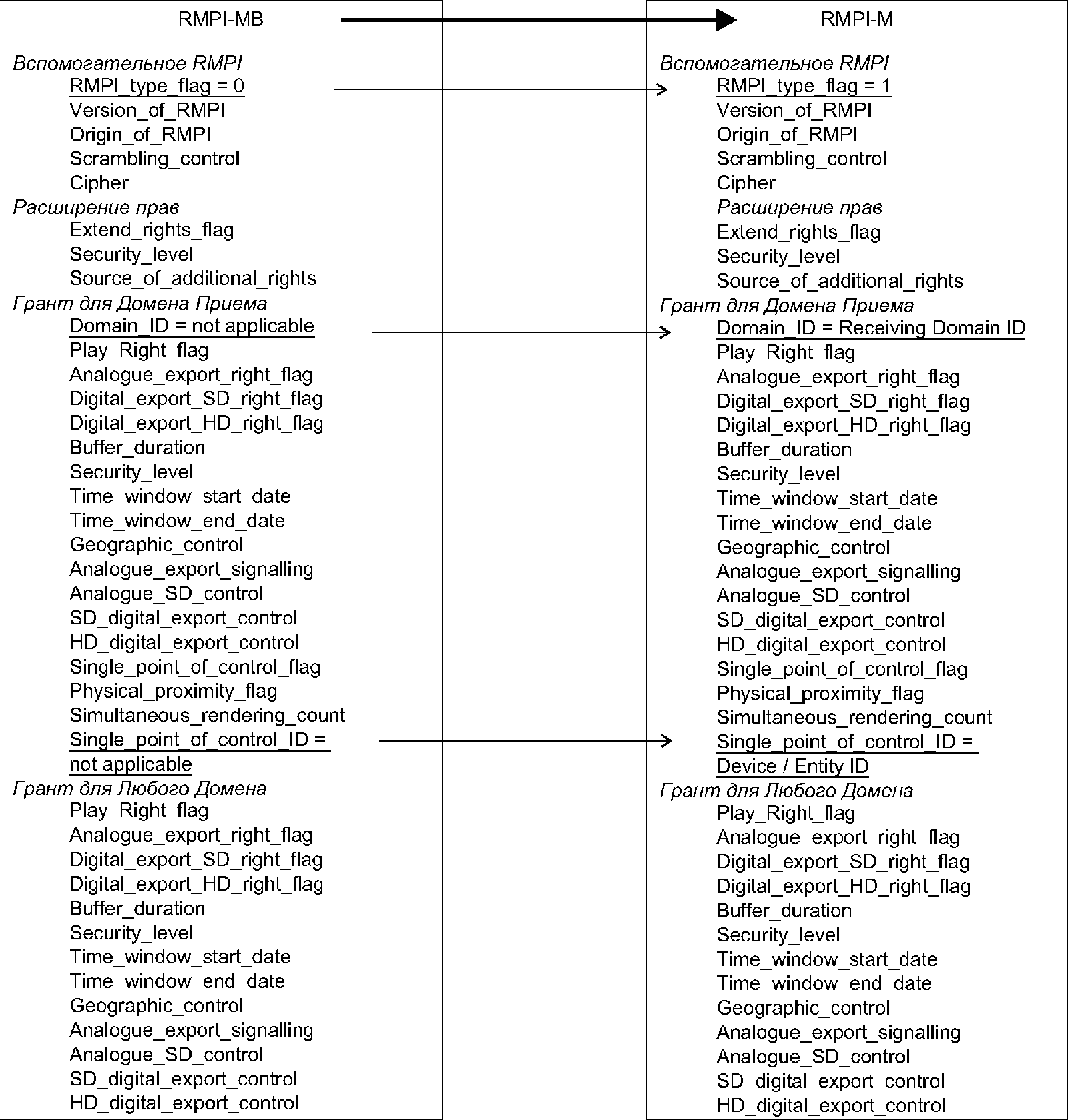 Информация RMPI-MB передается совместно с сигналом вещания. На момент приема в домене конечного пользователя RMP TVA она преобразуется в RMPI-M. Если флаг "scrambling_control" RMPI-MB установлен в 1, то переход от RMPI-MB в RMPI-M должен быть синхронизирован с процессом дескремблирования контента. Права, которые предоставляются принимающему домену и единственная точка управления (при наличии), в RMPI-MB переносятся в RMPI-M. Упоминание в RMPI-MB принимающего домена и единственной точки управления (при наличии) преобразовано в RMPI-M в явное упоминание с помощью идентификатора. Для поддержания персистентности прав, присвоенных вещателем или провайдером контента, приемник, совместимый с RMP TVA, не должен изменять какие-либо значения в RMPI. Права, предоставленные предикату Любой Домен, всегда переносятся в неизменном виде от RMPI-MB до RMPI-M.