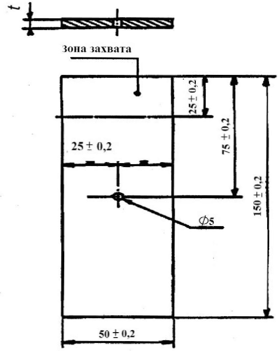рисунком 2. Ширину образцов измеряют с точностью до 0,2 мм, а толщину в центре - с точностью до 0,02 мм. Для испытаний отбирают 5 образцов.