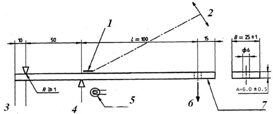 4.3.3.3 Для подвешивания груза в образце просверливают отверстие диаметром 6 мм на расстоянии 15 мм от одного края до центра отверстия по центральной линии образца