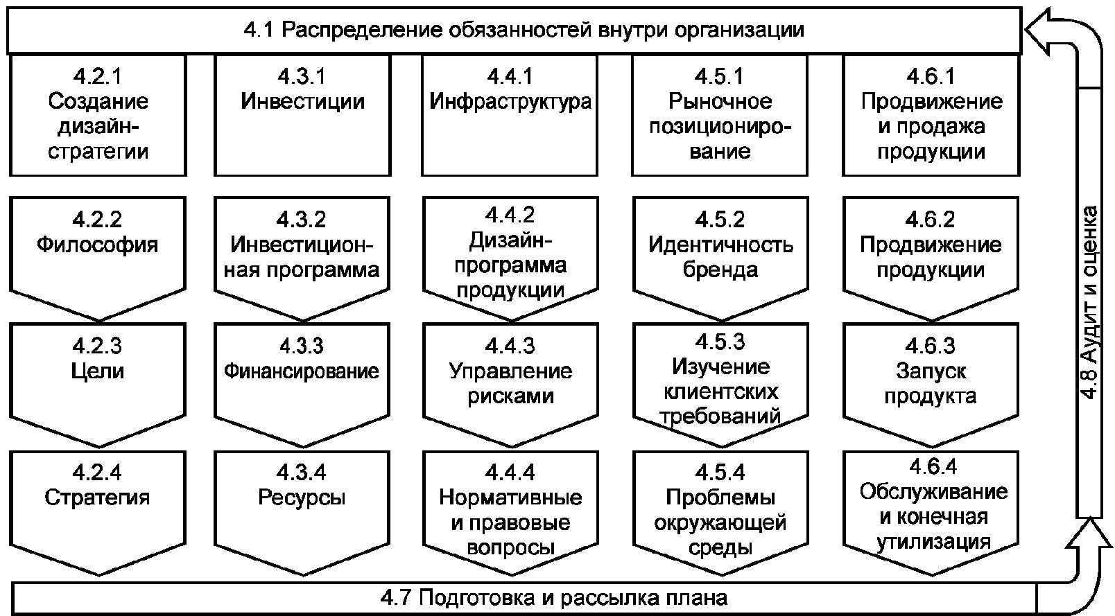 Дизайн должен быть формализован на основе стратегического планирования. Ниже приведен краткий перечень ключевых видов деятельности: a) укрепить стратегическую важность дизайна в решении вопросов дизайн-менеджмента, проводя регулярные совещания высшего руководства; b) определить и периодически обновлять дизайн-цели и стратегии, способствующие выполнению целей организации; c) сформулировать концепцию дизайна организации и продвигать ее; d) создать дизайн-программу и осуществлять ее контроль, проверку и обновление через соответствующие промежутки времени с целью поддержания ее актуальности для выполнения целей организации; e) обеспечить дополнение дизайн-программы, повышение ее качества и совместимость с другими крупными планами организации; f) понять риски и предпринять меры для устранения их последствий; g) определить эффективность инвестиций всех ресурсов, выделяемых для дизайна (а не только основные средства); h) запланировать обеспечение необходимым финансированием и другими ресурсами для эффективной реализации дизайн-программы организации; i) наложить обязанности в рамках деятельности по дизайну на компетентных и квалифицированных руководителей, мотивировать их на принятие данных обязанностей и их возможность осуществления деятельности в соответствии с техническими условиями; j) довести до сведения всех участников дизайн-цели, стратегии и программу организации и обеспечить общее понимание их содержания и смысла; k) внедрить и укрепить соответствующую систему дизайн-менеджмента и создать материально-техническую базу для поддержания соответствия дизайнерских работ требованиям стандарта, обеспечить ее интеграцию с другими процессами; l) осуществлять мониторинг и контроль затрат по планам и срокам, а также за выполнением отчета; m) использовать наиболее подходящий практический опыт и поднять на должный уровень выполнения стандарта за счет компетентности и профессиональной подготовки в области дизайн-менеджмента; n) поддерживать важность дизайн-процесса как стратегического ресурса, обеспечивая подлинное и видимое стремление к нему. |