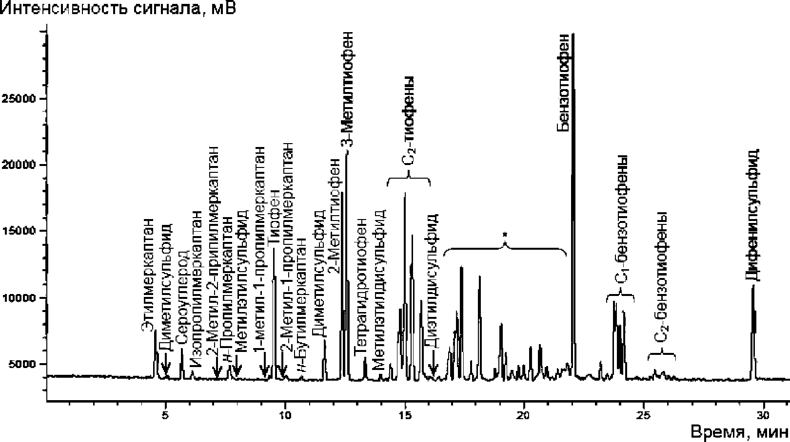 Массовую долю индивидуальных легко- и среднелетучих серосодержащих соединений (ССС) в СГК и дистиллятах определяют методом газовой хроматографии в режиме программирования температуры термостата колонок. После разделения определяемых компонентов на капиллярной колонке их регистрируют с помощью сероселективного детектора. При использовании ПФД (метод А) для вычисления концентрации ССС используют метод абсолютной градуировки по стандартным образцам состава газовых смесей или по градуировочным растворам. При использовании ХЛД (метод Б) вычисление концентрации ССС проводят методом внутреннего стандарта.