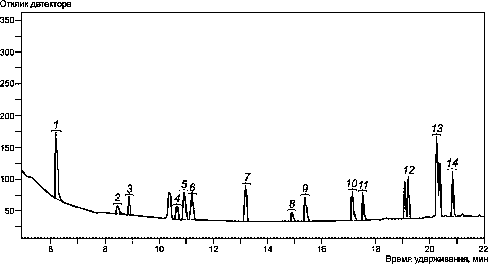 10 - метилэтилкетон (17,14 мин); 11 - этанол (17,51 мин);