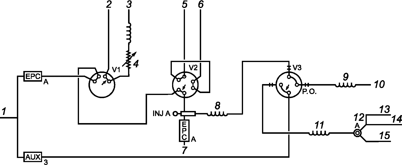 рисунке 3. Доводят температуру термостата колонки до 50 °C. Устанавливают клапан N 3 в положение "выключено", переводя систему на прямой поток. Поток из предколонки должен выходить через клапан N 3. Измеряют скорости потоков на выходе FID. Устанавливают вторичный регулятор массового расхода (Aux B) на скорость потока 8 мл/мин. Переводят клапан N 3 в положение "включено". Устанавливают основной регулятор массового расхода (Aux A) для получения суммарной скорости потока 12 мл/мин. Переводят клапан N 3 в положение "выключено". Включают потоки газов для детектора и зажигают пламя FID.