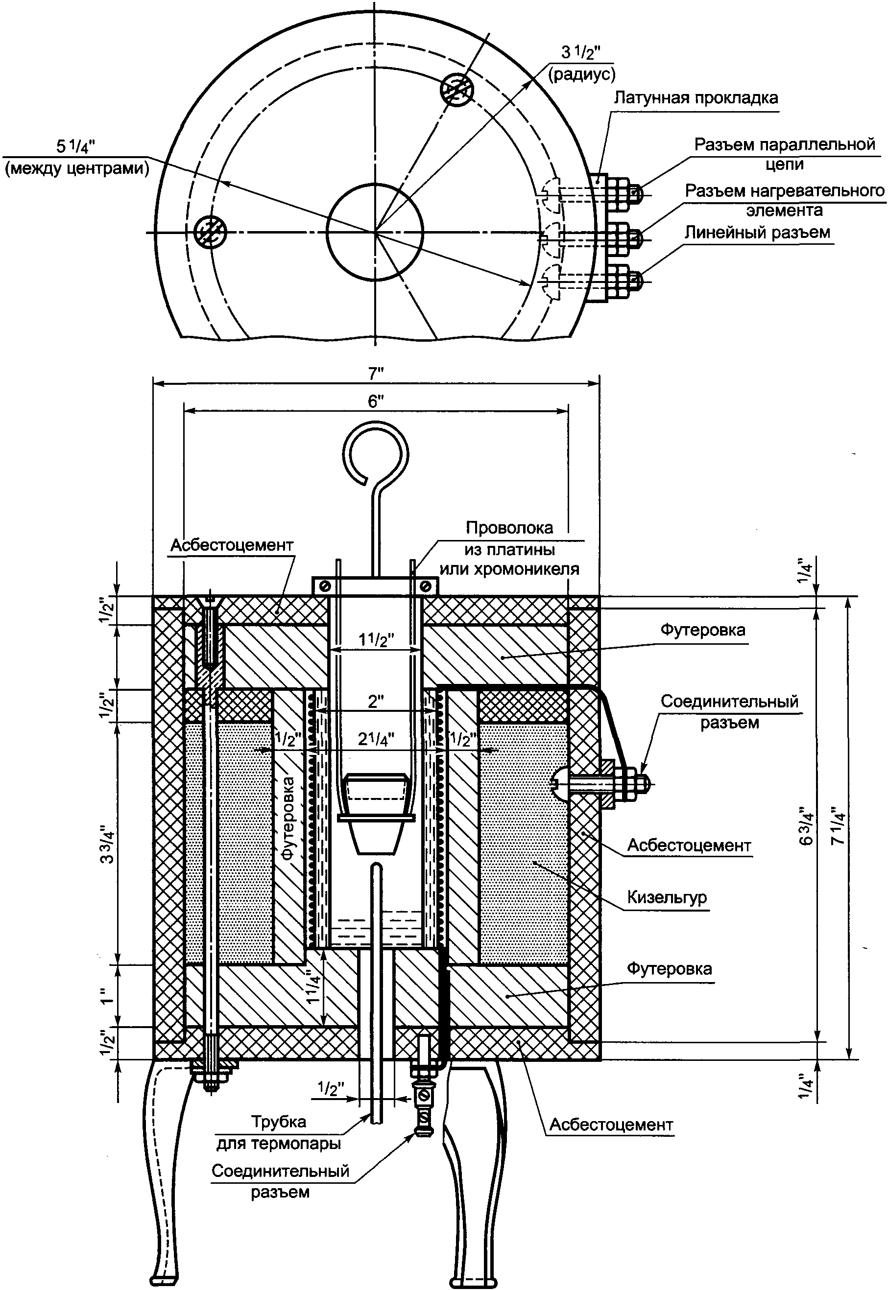 5.2 Вертикальная трубчатая электрическая печь - Пример печи показан на рисунке 1. Температуру нагрева печи регулируют и устанавливают такой, чтобы поддерживать температуру в тигле (950 +/- 20) °C. Контроль температуры осуществляют с помощью вставленной в печь термопары.