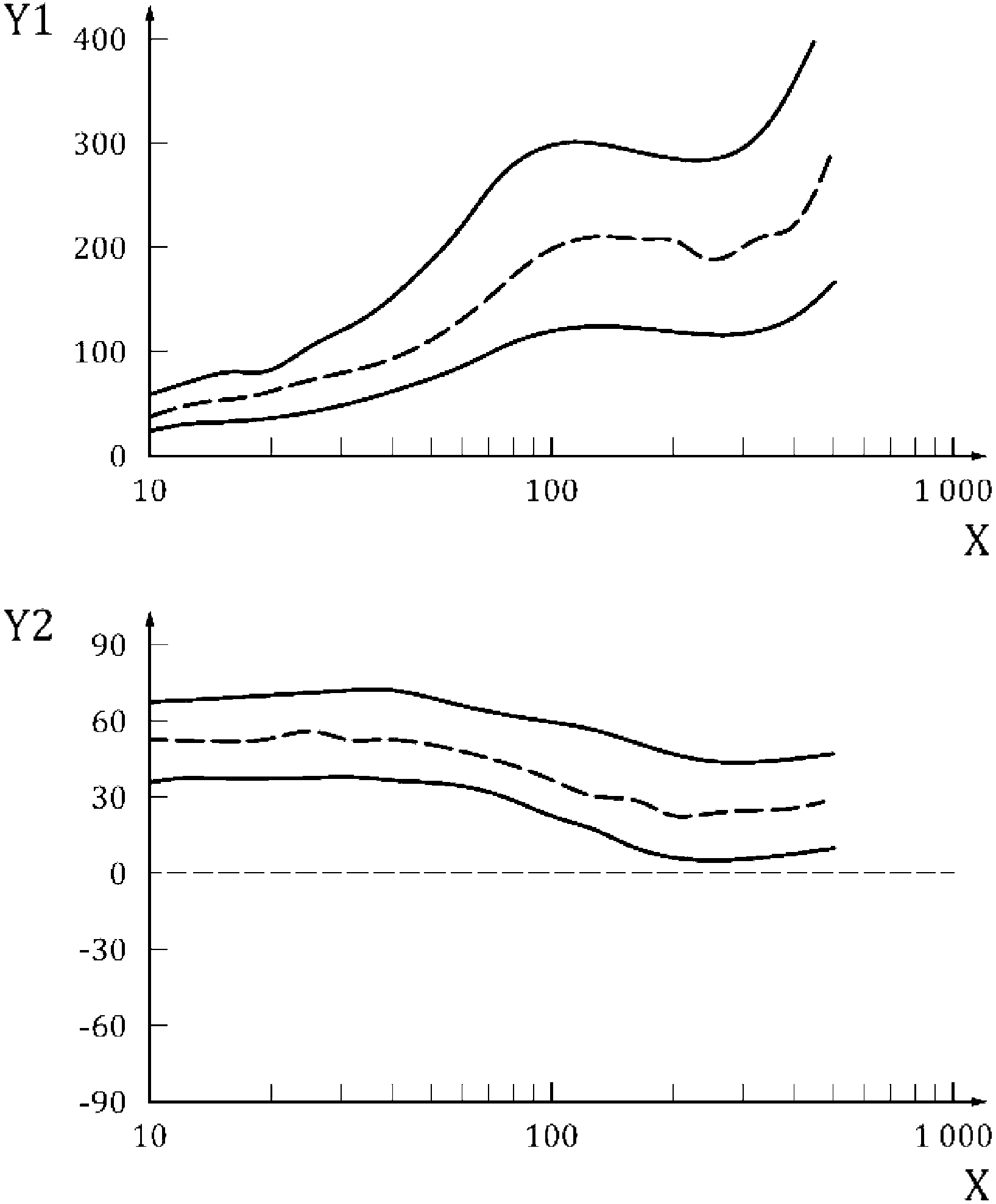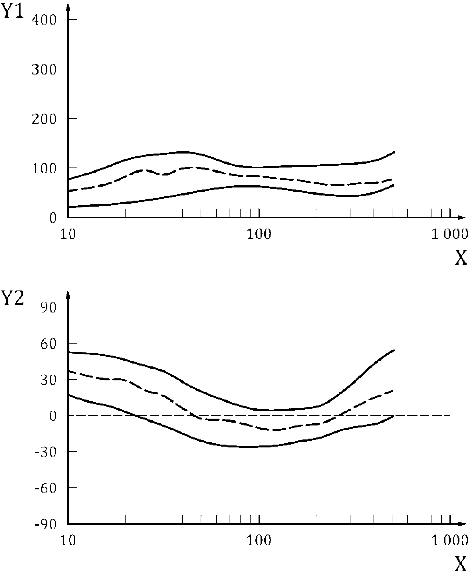 рисунок 5). Каждая таблица и каждый рисунок содержат по три значения модуля и фазы для каждого значения частоты, показывающих диапазон возможных изменений входного механического импеданса, - среднее значение, а также верхнее и нижнее граничные значения. Средние значения, полученные в каждом проведенном исследовании входного механического импеданса, попадают в диапазон между нижним и верхним граничными значениями. Нижняя и верхняя границы диапазона возможных значений на