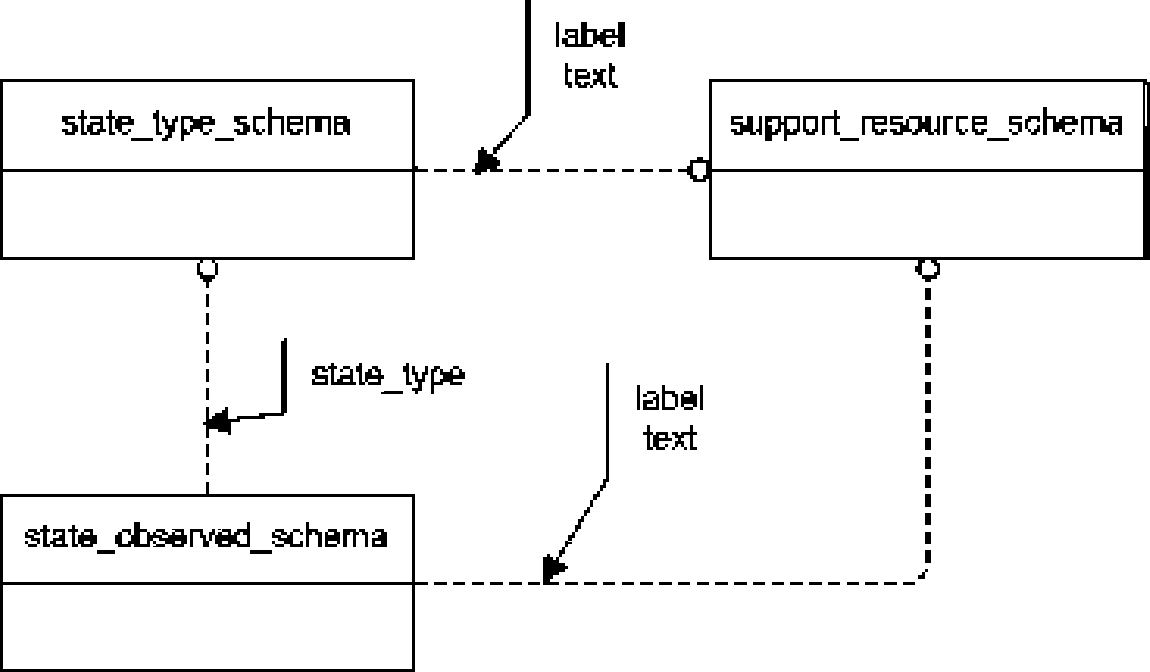 Примечание - Все возможные состояния элемента представляются как типы состояния, задаваемые посредством объекта state_type из схемы state_type_schema. Если элемент находится или наблюдается в одном из состояний, представляемых объектом state_type, элементу, используя определения, содержащиеся в схеме state_observed_schema, присваивается определенное состояние или наблюдаемое состояние.