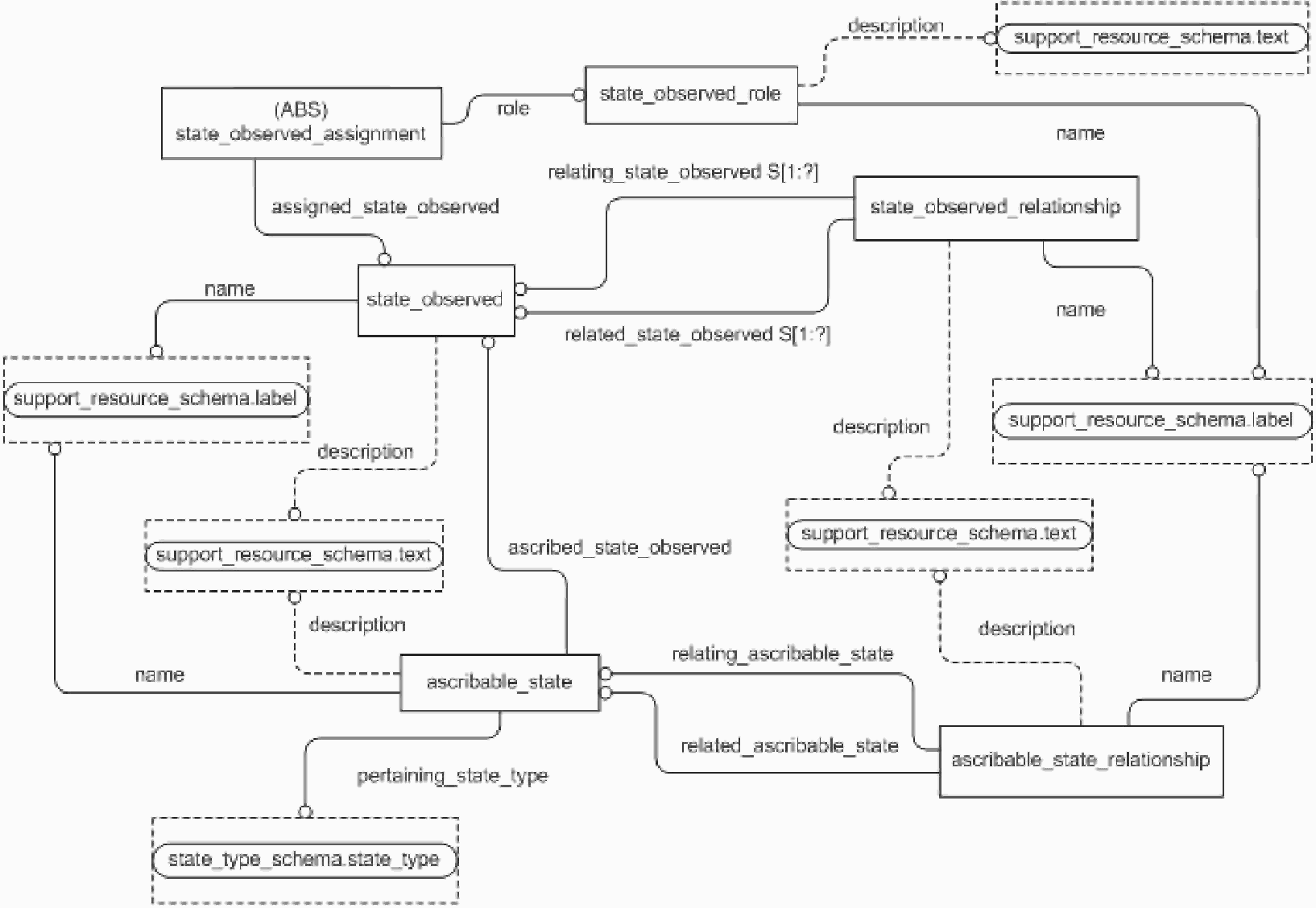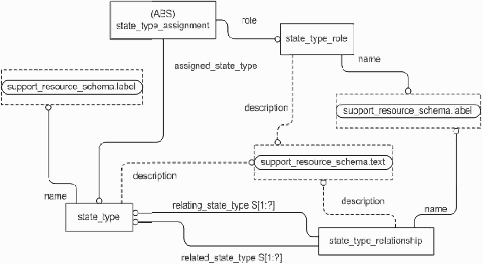 Могут задавать типы состояний, включающие несколько входящих типов подсостояний. Объект state_type, представляющий тип состояния, может быть связан с другим объектом state_type отношением "вызывается" или "является результатом", когда одно состояние вызывается другим состоянием или возникает в результате другого состояния. Также типы состояний могут быть связаны последовательно, когда элемент из одного состояния может переходить в другое состояние. Природа отношения между двумя состояниями, представленными объектами state_type, определяется значениями атрибутов role (роль) и description (описание) объекта state_type_relationship, представляющего отношение между типами состояний.
