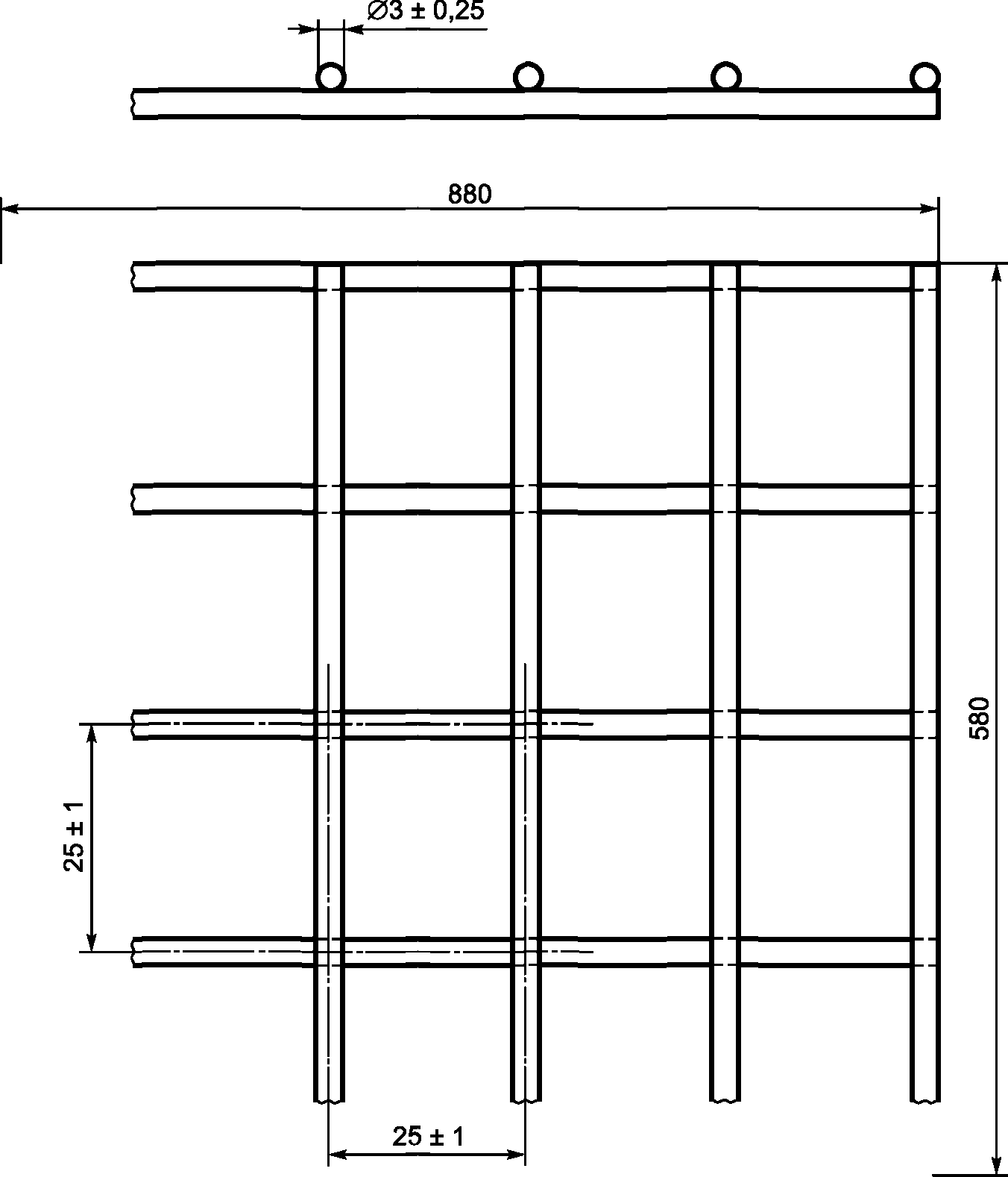 2), длиной и шириной на 20 мм меньше внутренних размеров емкости. Дренажный экран изготовлен из сваренных вместе стержней диаметром (3 +/- 0,25) мм, формирующих квадратную сетку с расстояниями между центрами стержней (25 +/- 1) мм. Стержни, параллельные длине дренажного экрана, располагаются снизу стержней, параллельных ширине дренажного экрана.
