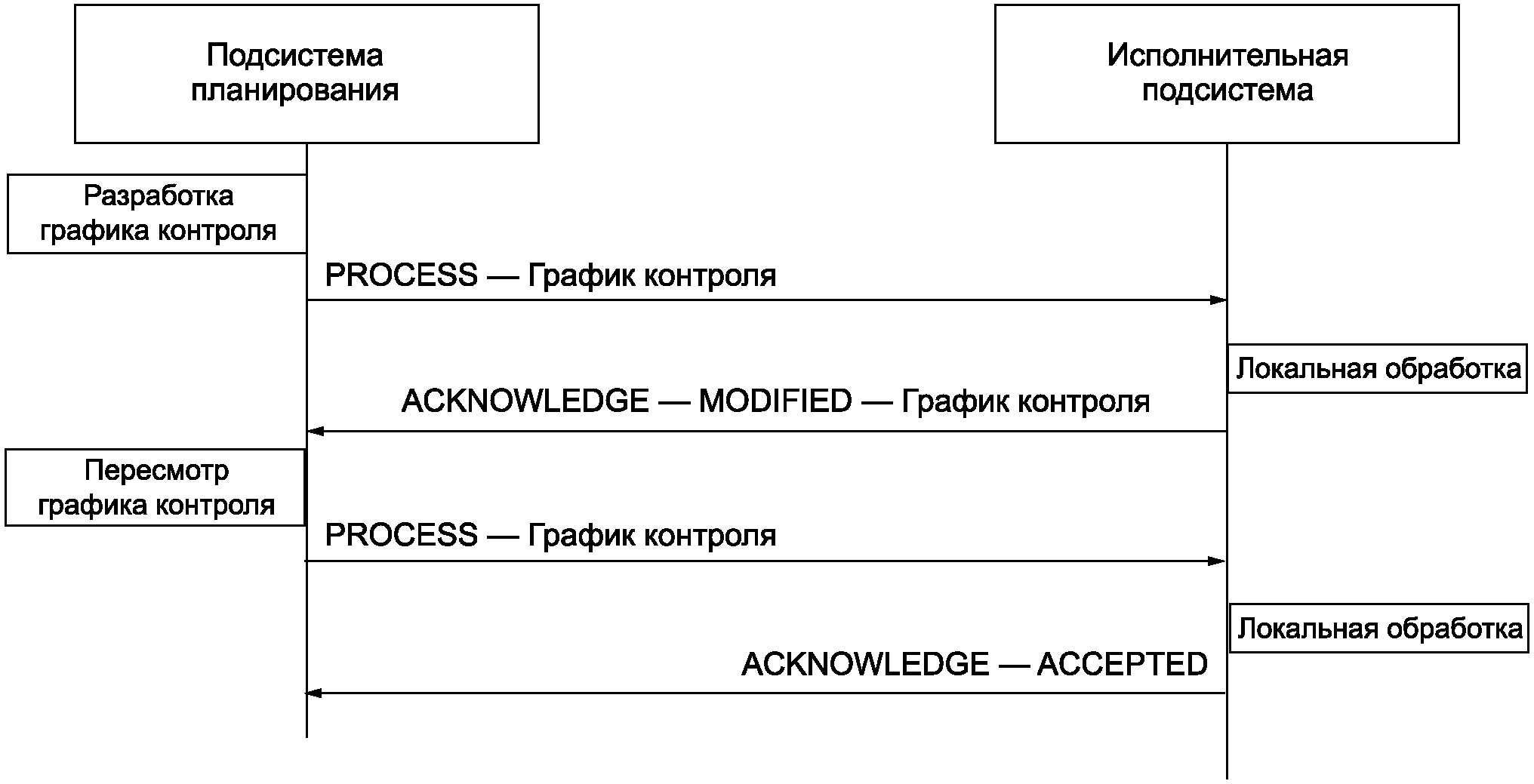 Пример - На рисунке A.10 показана последовательность сообщений в системе контроля состояния и диагностирования, идущих от планирующей подсистемы к исполнительной подсистеме. Получено исходное сообщение PROCESS с графиком контроля с заданной периодичностью. Возвращено сообщение ACKNOWLEDGE с флагом MODIFIED с графиком, где период между последовательными процедурами контроля увеличен, поскольку исполнительная подсистема определила невозможность реализации графика с предлагаемой периодичностью контроля. По получении предложения о модификации планирующая подсистема принимает решение о сокращении времени контроля за счет исключения одного из датчиков, но сохранения изначально предложенной периодичности контроля, и повторно направляет сообщение PROCESS исполнительной подсистеме. Исполнительная подсистема принимает график контроля и возвращает сообщение ACKNOWLEDGE с флагом ACCEPTED.