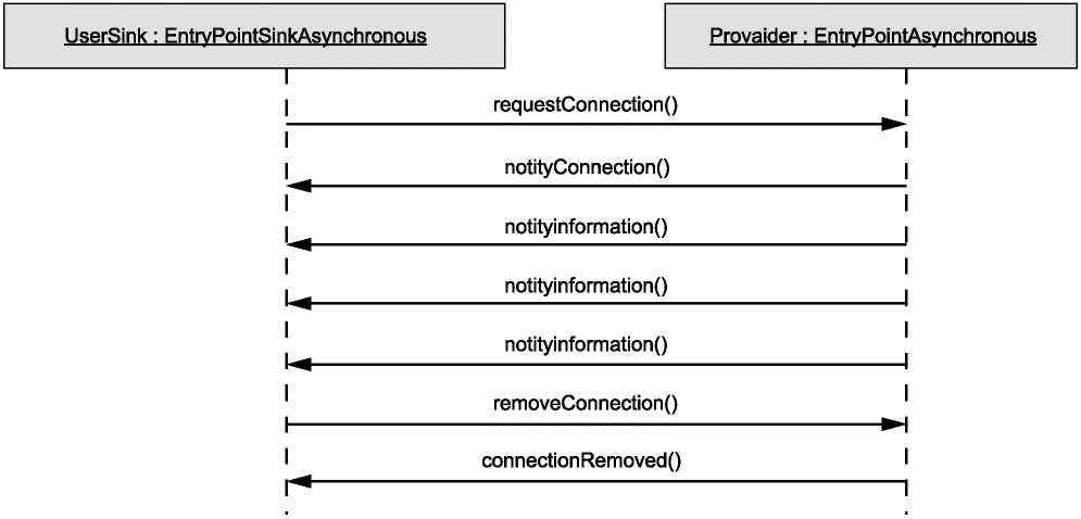 Асинхронный интерфейс типа 1 со стороны провайдера реализует метод "соединение с уведомлением" (notify connection), позволяющий потребителю определить, как получить информацию через приемник. Он позволяет также выполнить удаление соединения (remove Connection), в результате чего потребитель удаляется из списка провайдера. Интерфейс пользователя позволяет получать сообщения от провайдера об установлении и удалении соединения. Пример реализации данного интерфейса показан на рисунке 6.