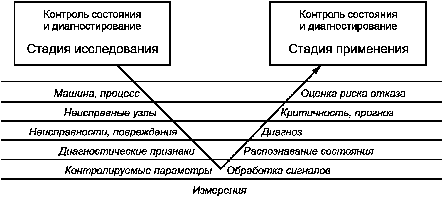 Правая ветвь диаграммы соответствует работам по контролю технического состояния и диагностированию, которые обычно проводят после приемки машины в эксплуатацию. Левая ветвь - предварительным исследованиям для конкретной машины, которые проводят, чтобы получить необходимую информацию для организации контроля состояния и диагностирования. Каждому уровню обобщения информации на диаграмме соответствует своя задача стадии предварительного исследования (левая ветвь) и своя задача стадии применения (правая ветвь).