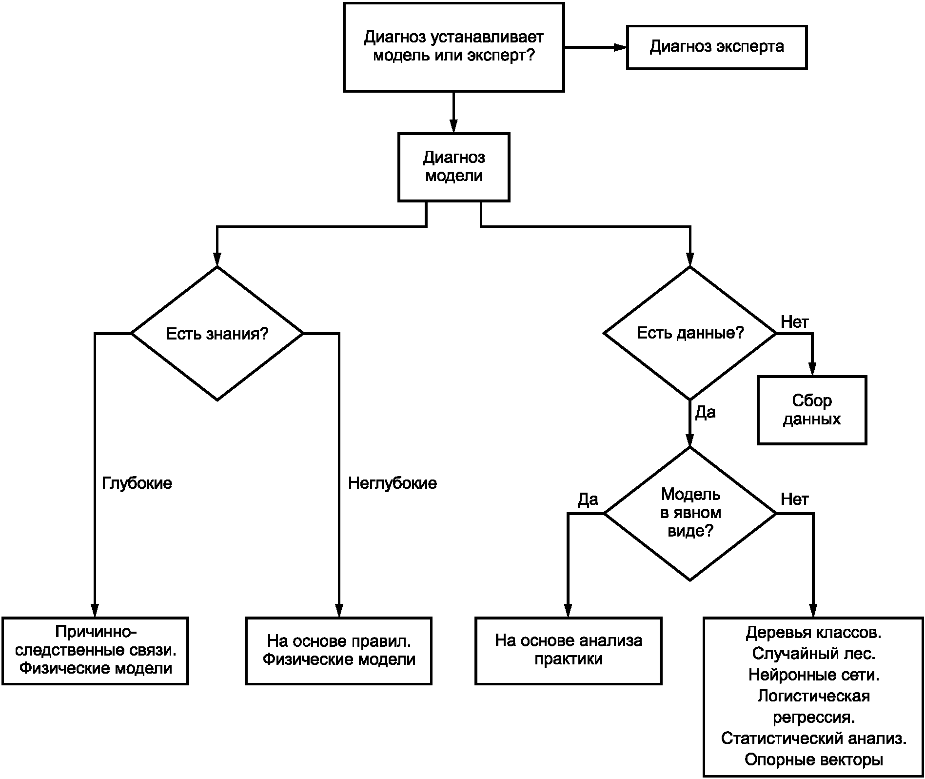 Метод на основе правил | Человеческий опыт | Относительно прост в применении | Неполнота Трудность объяснения одновременных неисправностей Сложность толкования Чувствительность к изменениям системы | Диагностирование оборудования вращательного действия Медицинская диагностика |