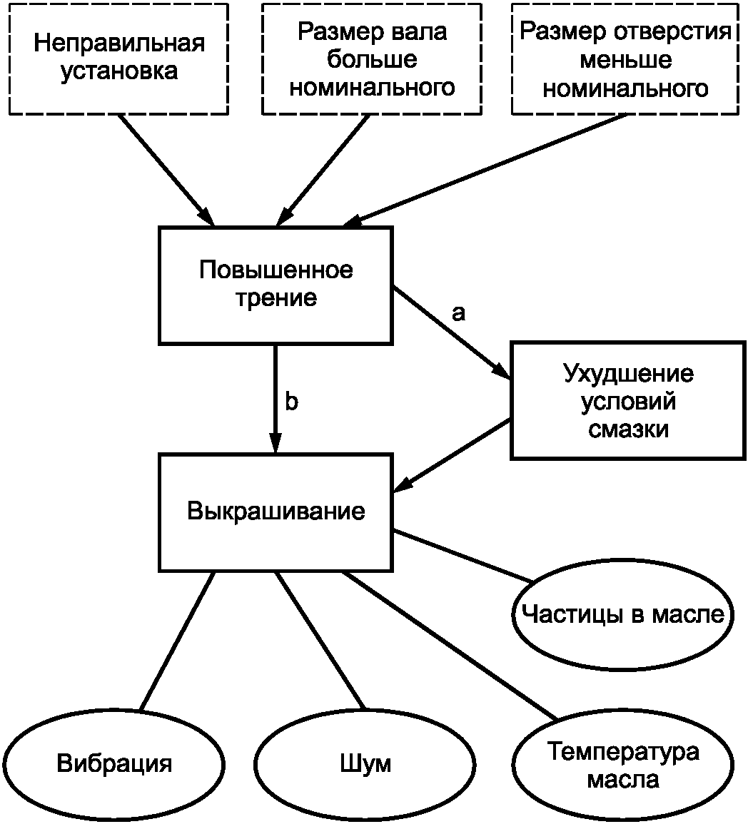 Однако следует избегать использования одного и того же термина при определении вида отказа и его причины для одного узла или машины. Для каждого узла (машины) вид отказа, его последствия и причина должны быть указаны в их причинно-следственной связи. При определении вида отказа, его последствия и причины необходимо иметь в виду, что последствие определяется видом отказа, который, в свою очередь, является следствием определенной причины.