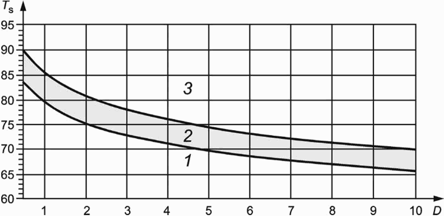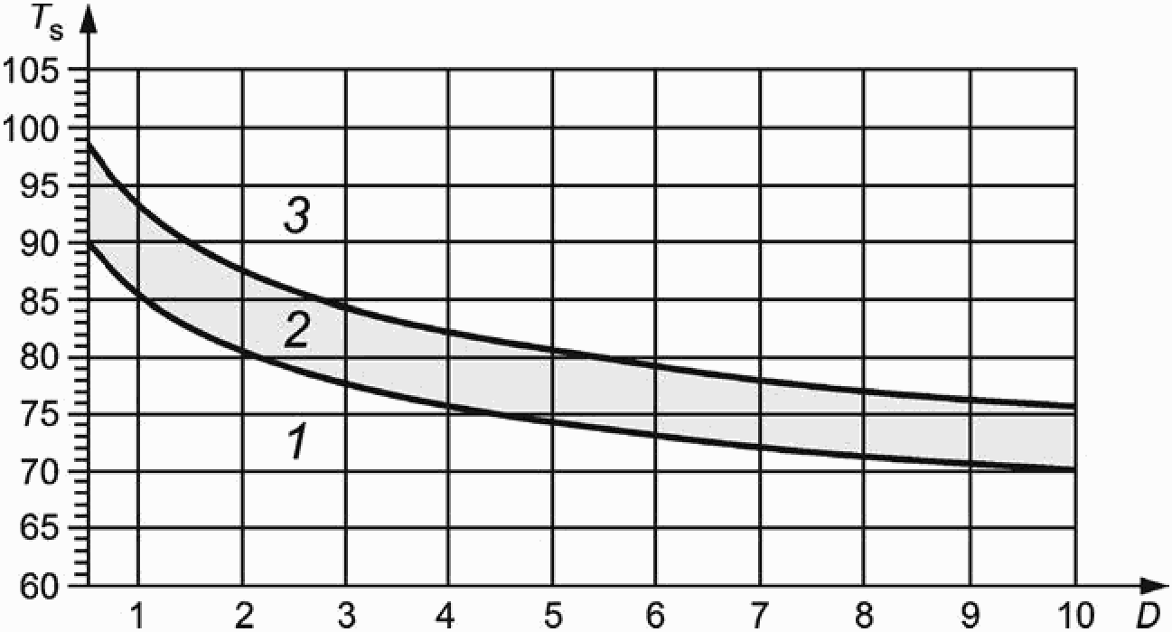 Точки на кривой указывают (для определенного периода контакта) температуру поверхности между отсутствием ожога кожи и началом возникновения поверхностного ожога при контакте кожи с горячей поверхностью. Значения температуры поверхности, лежащие ниже кривой, не приводят к ожогу. Значения температуры поверхности, лежащие выше кривой, приведут к ожогу кожи (см.