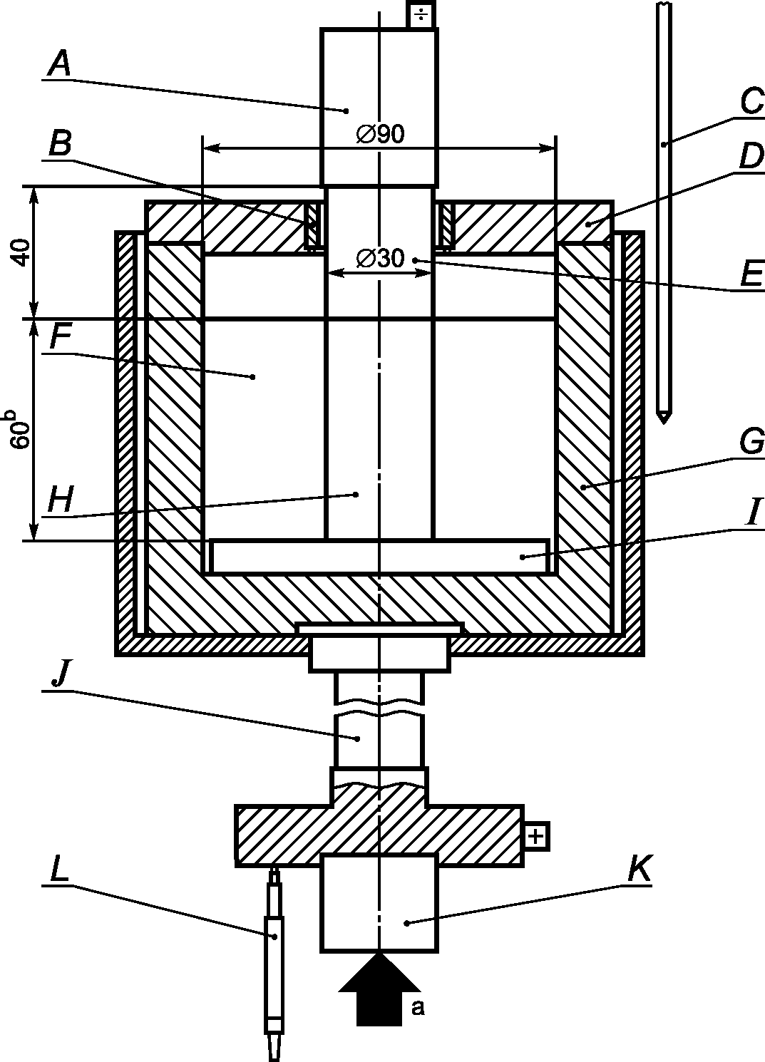 крышка; E - графитовый цилиндр; F - расплав криолита;