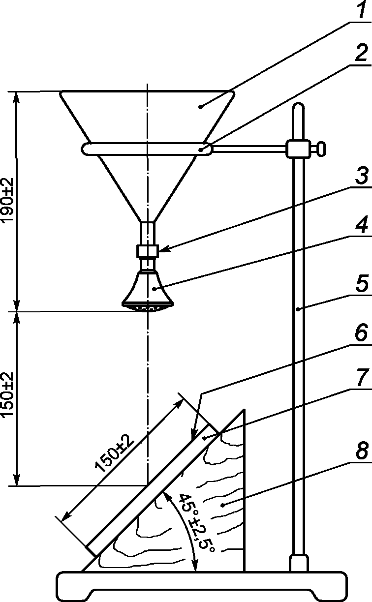 рисунке 1, состоящее из закрепленной вертикально воронки диаметром (150 +/- 2) мм, с металлическим разбрызгивающим соплом (см.