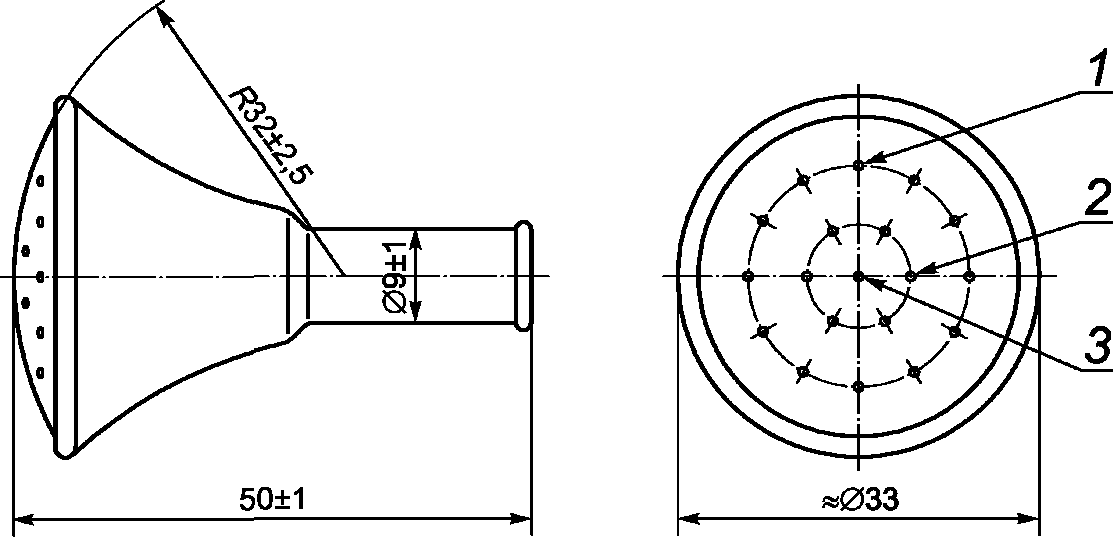 5.2 Сопло металлическое разбрызгивающее, как показано на рисунке 2, диаметром приблизительно 33 мм, имеющее выпуклую переднюю поверхность, на которой равномерно распределено 19 отверстий диаметром (0,9 +/- 0,05) мм. Время протекания (250 +/- 5) мл дистиллированной или деионизованной воды, налитой в воронку, должно составлять (27,5 +/- 2,5) с.