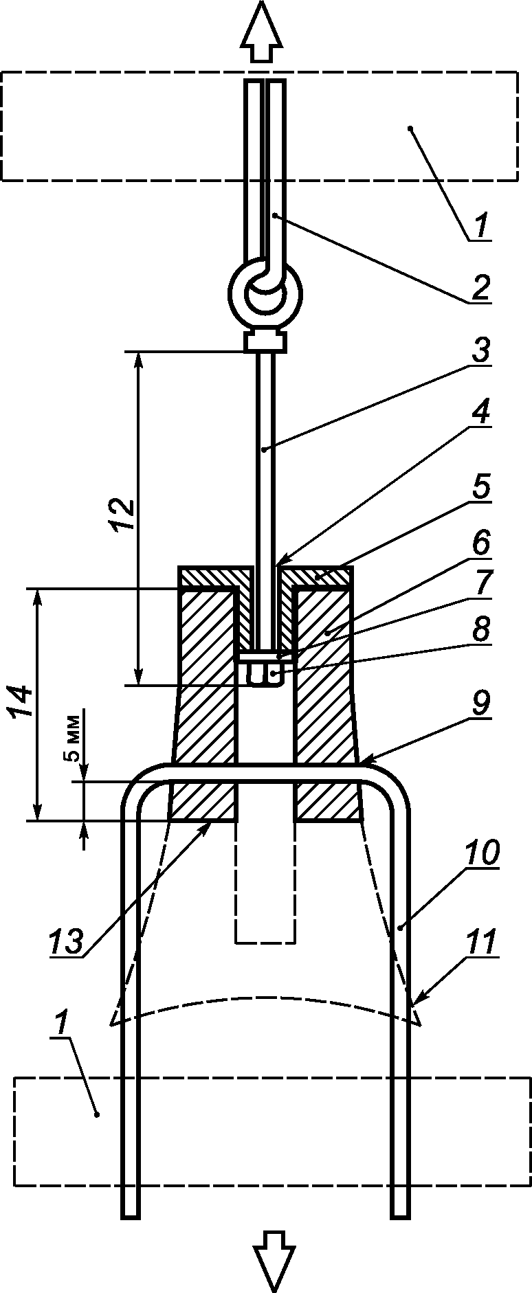 1 - зажим разрывной машины; 2 - стержень к верхнему зажиму;