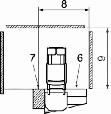 h) Размещают загруженное устройство для преодоления лестниц на верхней лестничной площадке перед оковкой ступени под номером 8 в положении, соответствующем наименьшей ширине ступени или минимальному радиусу лестницы, который соответствует инструкции изготовителя по применению. Если инструкция по применению не содержит такую информацию, размещают устройство для преодоления лестниц в точке, где ширину рассчитывают по формуле, приведенной в