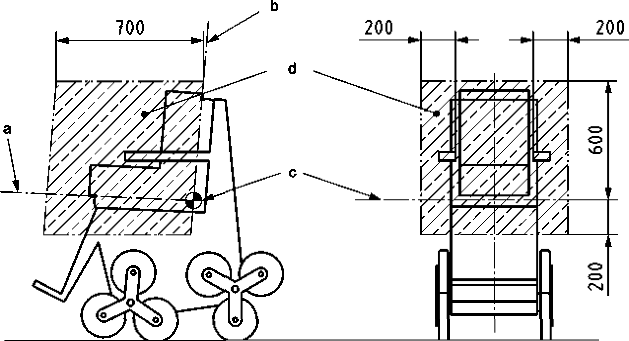 c) Размещают загруженное устройство для преодоления лестниц на нижней лестничной площадке перед ступенью под номером 1 в положении, соответствующем наименьшей ширине ступени или минимальному радиусу лестницы, который соответствует инструкции изготовителя по применению. Если инструкция изготовителя по применению не содержит такую информацию, размещают устройство для преодоления лестниц в точке, где ширину вычисляют по формуле, приведенной в