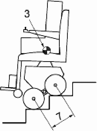 h) Размещают загруженное устройство для преодоления лестниц на верхней лестничной площадке перед оковкой ступени под номером 8 в положении, соответствующем наименьшей ширине ступени или минимальному радиусу лестницы, которое соответствует инструкции изготовителя по применению. Если инструкция по применению не содержит такую информацию, размещают устройство для преодоления лестниц в точке, где ширину рассчитывают по формуле