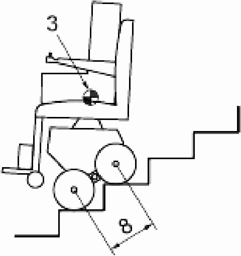 перечислениям c) - e), как необходимо, при преодолении лестницы устройством для преодоления лестниц, ступенчато смещают барьеры для увеличения эффективного внутреннего радиуса лестницы и определяют минимальный внутренний радиус винтовой лестницы, которая может быть преодолена при подъеме вверх без контактирования устройства для преодоления лестниц, испытуемого кресла-коляски (если используют), испытательного манекена или любого ограничителя пространства с барьерами.