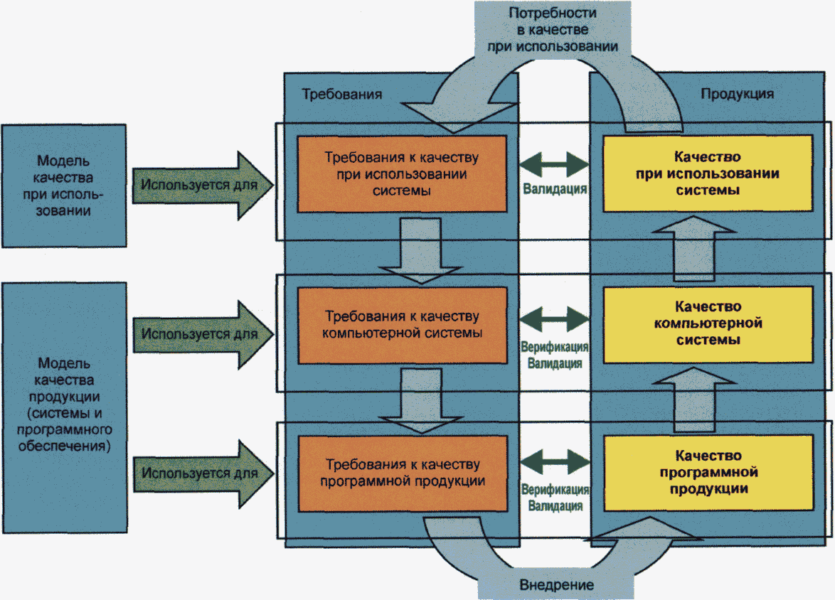 Кроме того, модель жизненного цикла качества системы/программного обеспечения требует, чтобы достижение надлежащих уровней качества для каждого типа качества было неотъемлемой частью процессов разработки, включая определение требований, реализацию и подтверждение достоверности результатов.