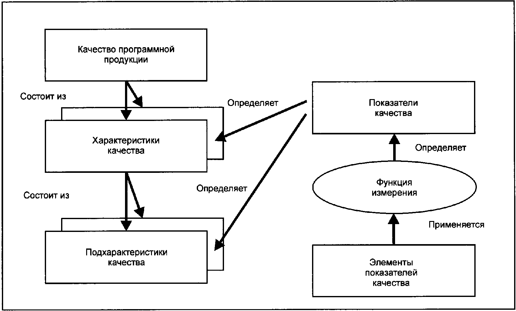 Для каждой подхарактеристики возможности программного обеспечения определены совокупностью статических внутренних свойств, которые могут быть измерены. Примеры внутренних показателей даны в ИСО/МЭК ТО 9126-3 (подлежат замене ИСО/МЭК 25022). Характеристики и подхарактеристики могут быть измерены извне в той степени, в которой эта возможность обеспечивается системой, содержащей программное обеспечение. Примеры внешних показателей даны в ИСО/МЭК ТО 9126-2 (подлежат замене ИСО/МЭК 25023).