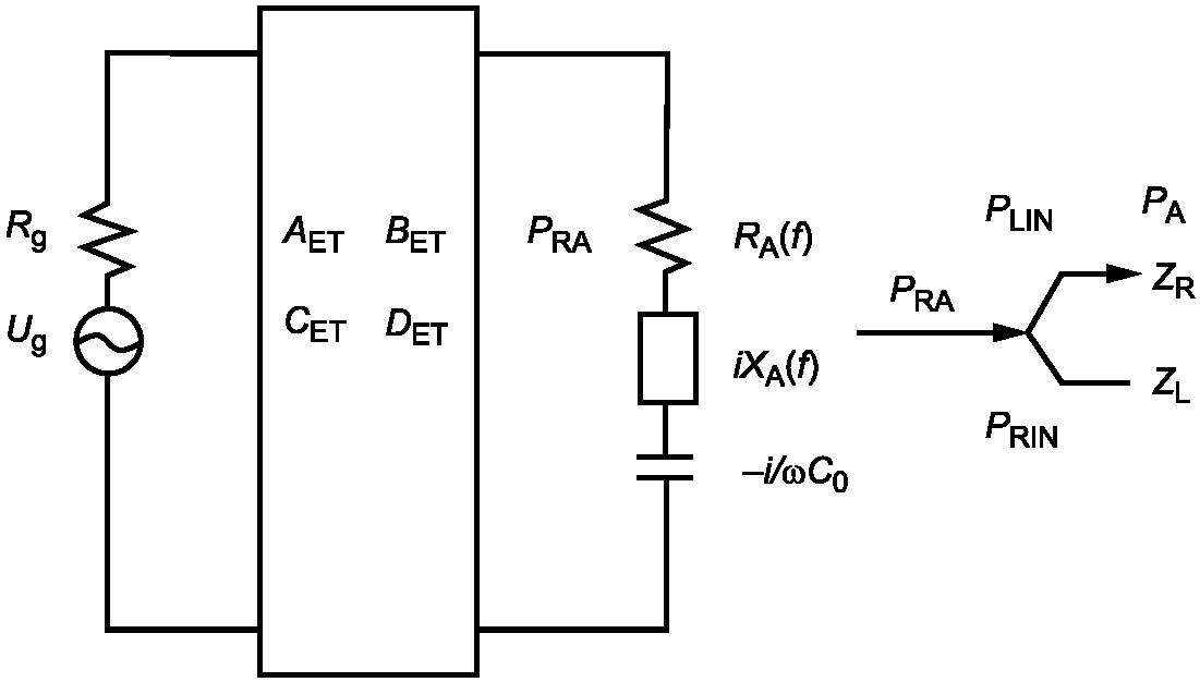 В случае если источник подключен к преобразователю не напрямую, промежуточную схему можно представить так, чтобы найти мощность на сопротивлении излучения стандартными методами расчета, используемыми в электротехнике и рассмотренными выше. Например, для четырехполюсника ABCD и источника с импедансом Rg на каждой частоте