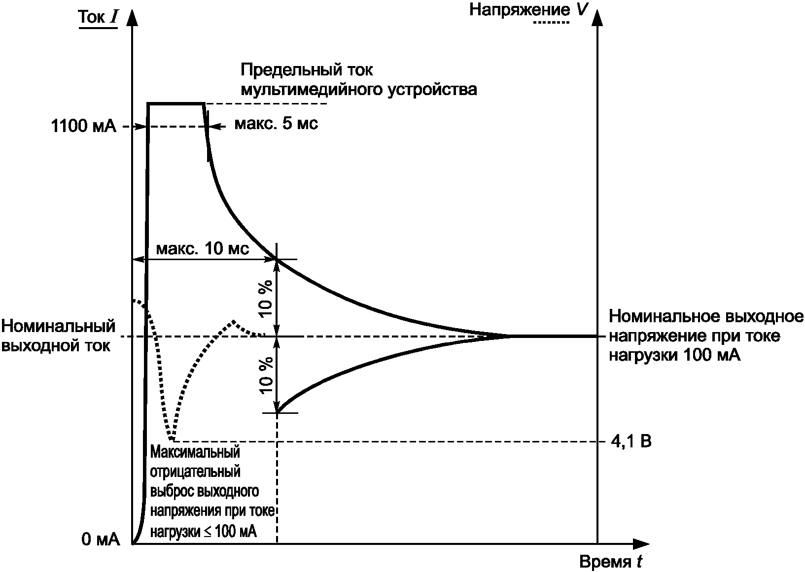 Например, аксессуар может иметь ток потребления Imax = 10 мА до тех пор, пока зарядное напряжение Vchar ниже 3,5 В, и при загрузке мультимедийного устройства.