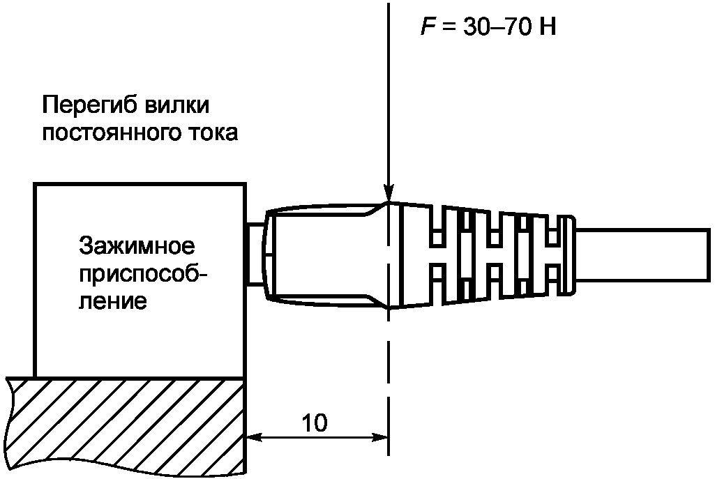 Зарядная вилка двухмиллиметрового цилиндрического интерфейса при проведении испытаний на перегиб согласно рисунку C.3 должна разрушаться при приложении усилия от 30 до 70 Н.