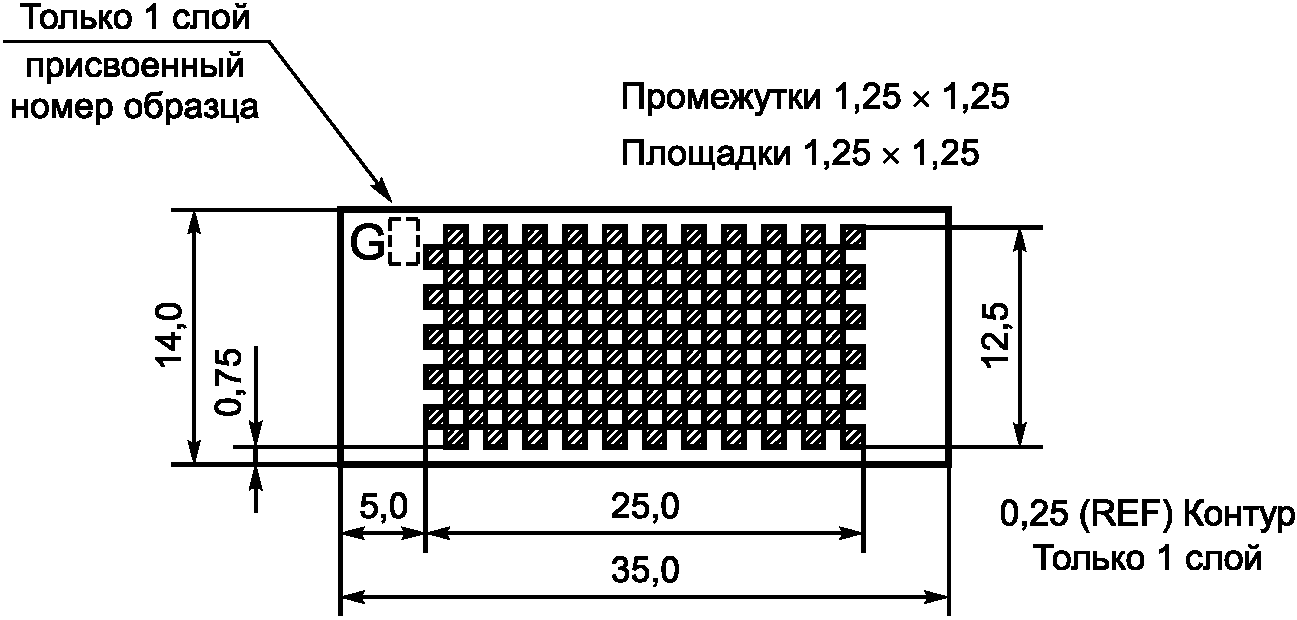 В.10 Купон G служит для оценки адгезии паяльного резиста. Для нанесения паяльной маски на печатную плату должен быть представлен фотошаблон. Конфигурация тест-купона должна соответствовать рисунку. На