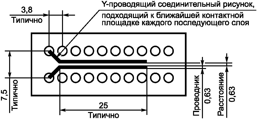 В.9 Если проводящий рисунок используют для поверхностного монтажа, то для оценки сопротивления изоляции и чистоты отмывки печатной платы может быть использован дополнительный тест-купон. Проводящий рисунок в виде буквы Y, представленный на