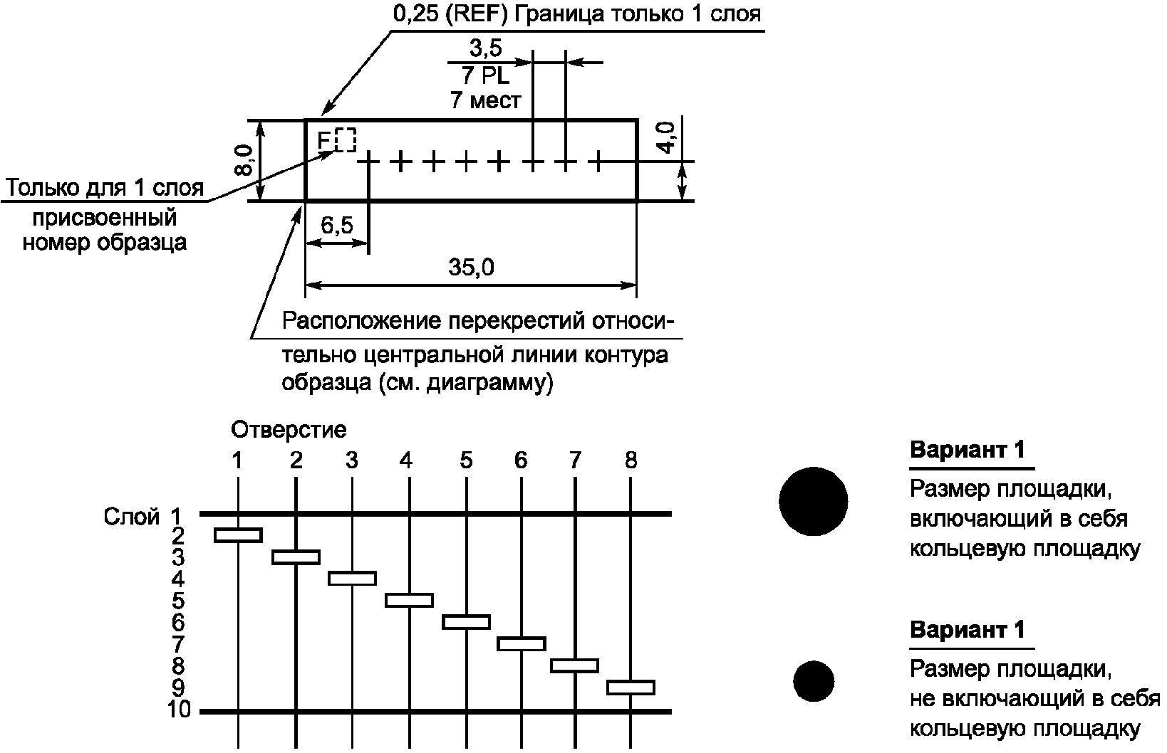 В.2 представлены основные формы тест-купонов для сквозных отверстий. Для контроля глухих и внутренних переходных отверстий и межсоединений предусматривается дополнительный тест-купон.