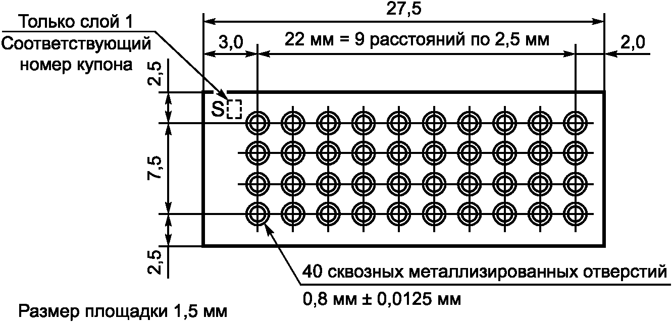 В.13 Тест-купон S может быть использован для контроля паяемости сквозного металлизированного отверстия, если требуется провести проверку большого количества отверстий. Диаметр отверстий, требуемый для заполнения припоем, должен быть в пределах 0,8 - 0,13 мм. Чертеж купона представлен на