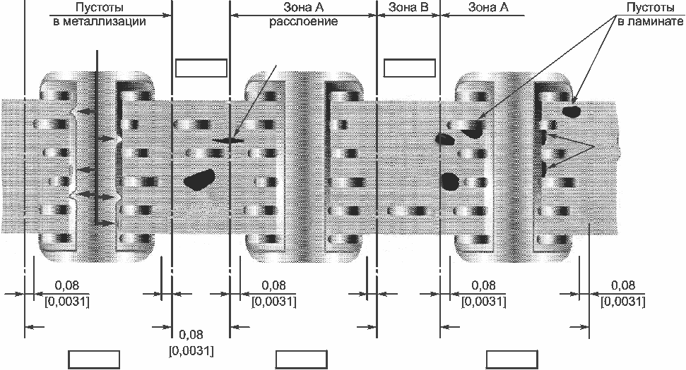 Пустоты в диэлектрическом основании | Пустоты в пограничной линии, которые перекрывают зоны A и B или полностью находятся в зоне B, не должны превышать 150 мкм | Пустоты в пограничной линии, которые перекрывают зоны A и B или полностью находятся в зоне B, не должны превышать 80 мкм | |