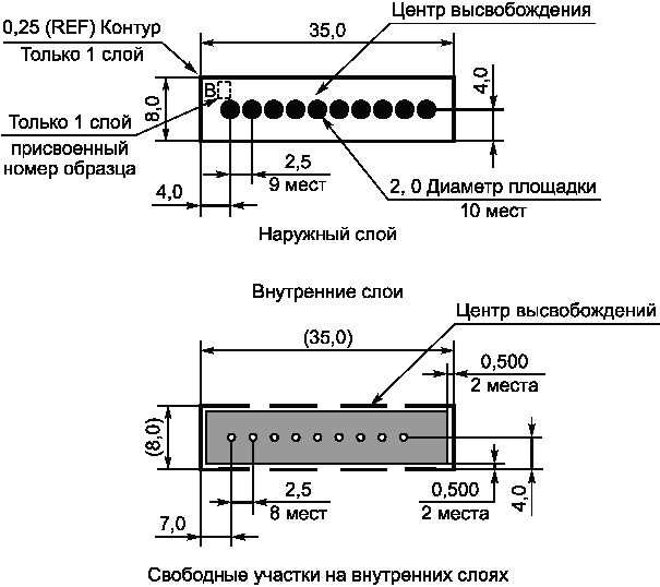 На внутренних слоях платы используется рисунок из десяти отверстий с межцентровым расстоянием 2,5 мм, проходящих через медную поверхность с концентрическими высвобождениями в медной фольге вокруг девяти отверстий. Диаметры высвобождений для отверстий имеют пошаговый прирост 0,05 мм. Для десятого отверстия высвобождения нет, т.е. оно соединено с медной поверхностью.