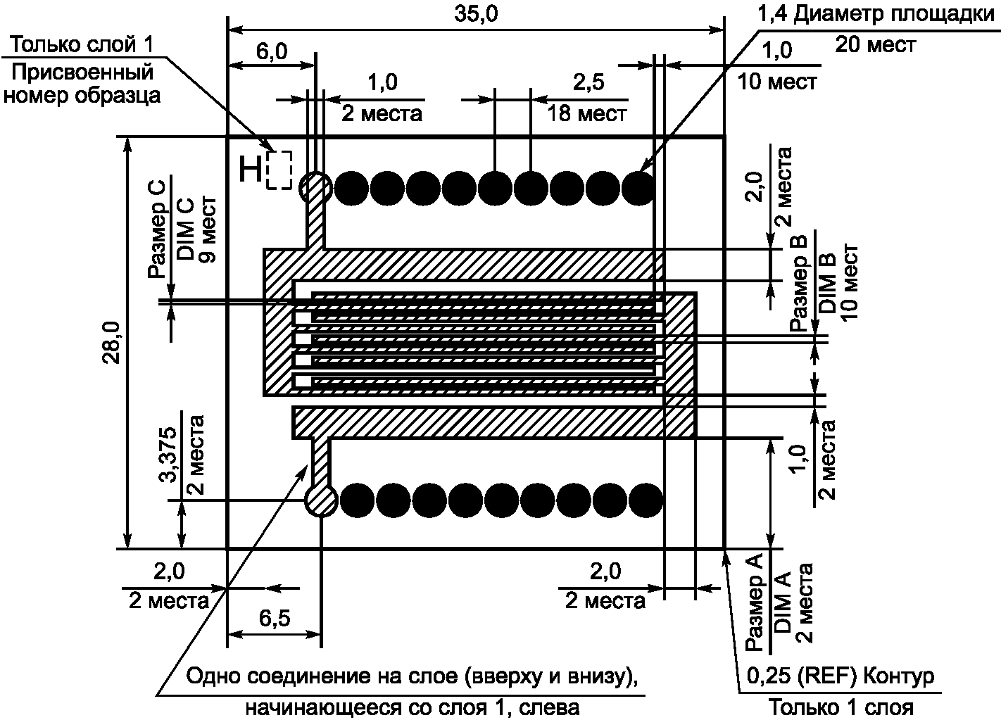 В.6 Тест-купон H используют для испытаний сопротивления изоляции печатных плат, применяемых в ответственной аппаратуре, например телекоммуникационной аппаратуре. Типичная его конструкция приведена на