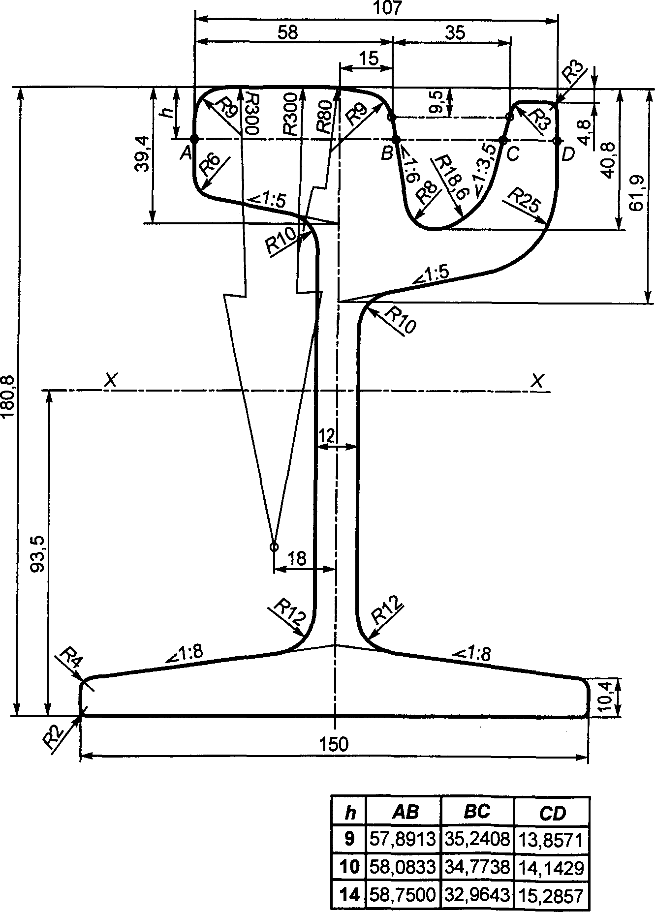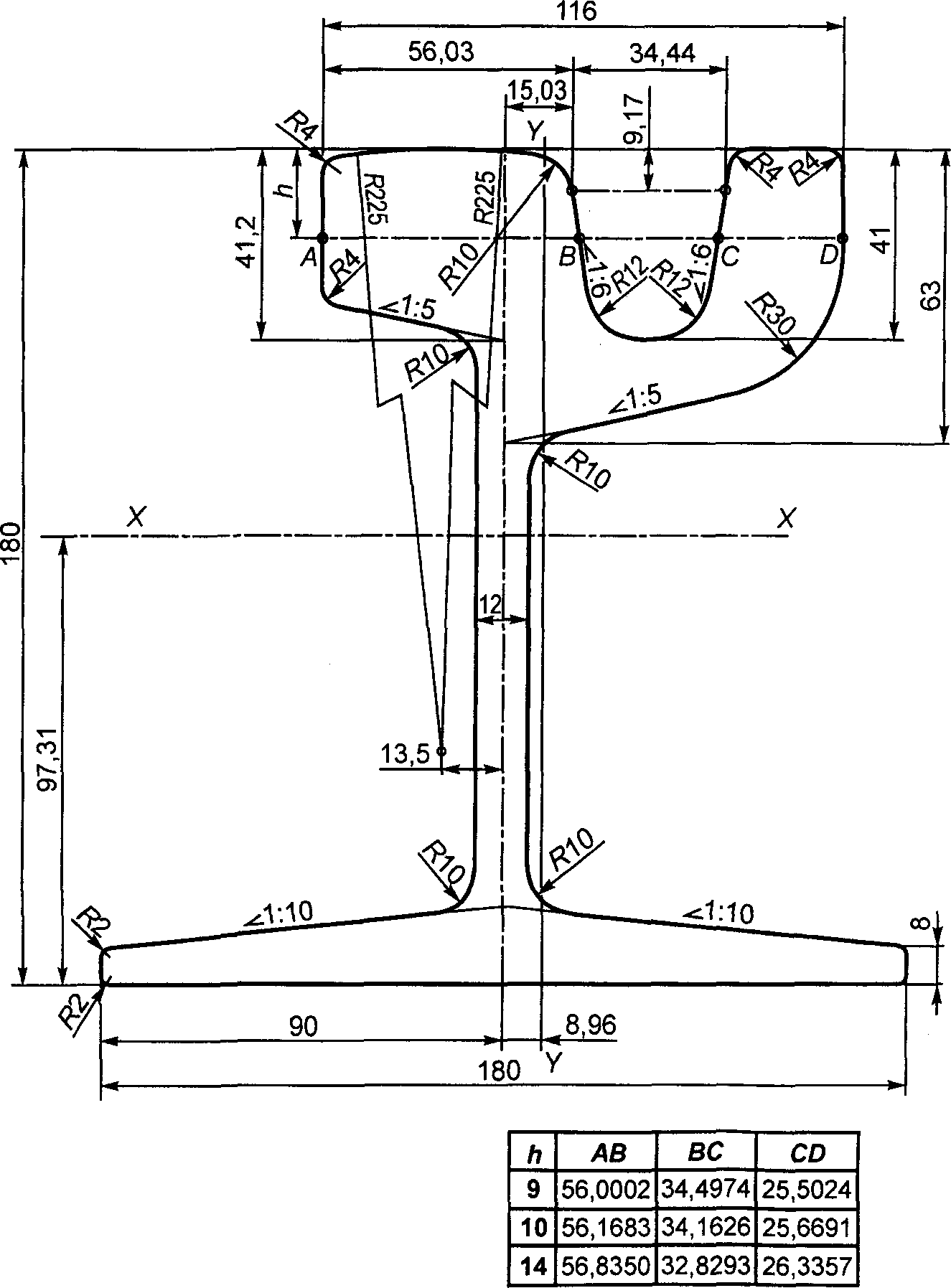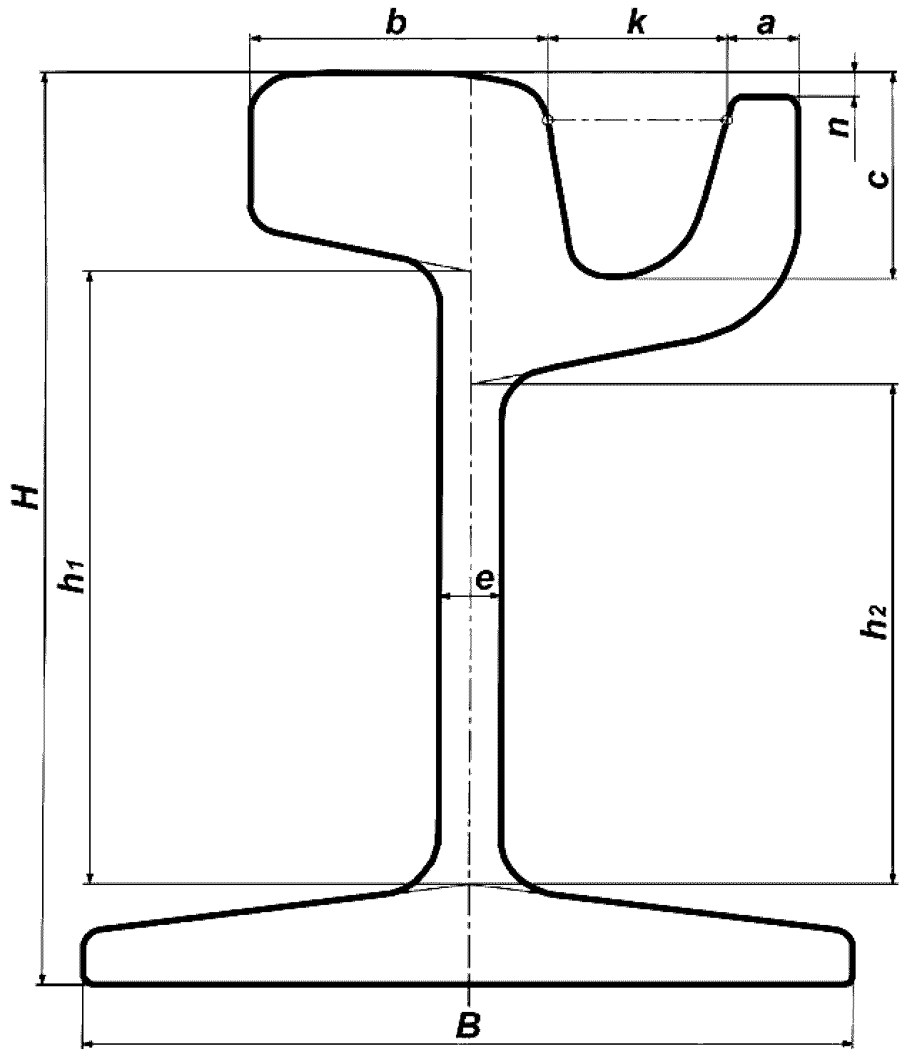 Примечание. Площадь поперечного сечения рельса и справочные величины вычислены по номинальным размерам. При расчете массы рельса плотность стали принята равной 7850 кг/м3. |