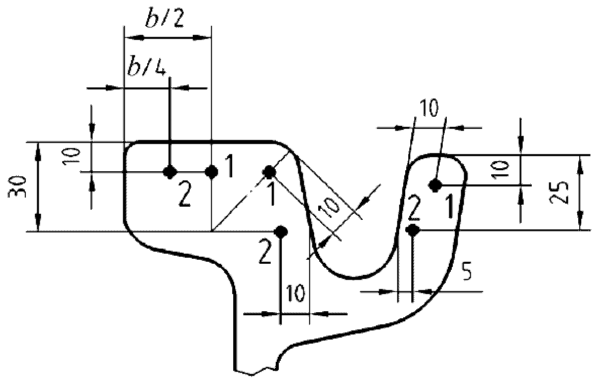 Рельсы с термически упрочненной поверхностью катания и желоба дополнительно контролируют на твердость по сечению головки и губы. Расположение точек контроля твердости приведено на