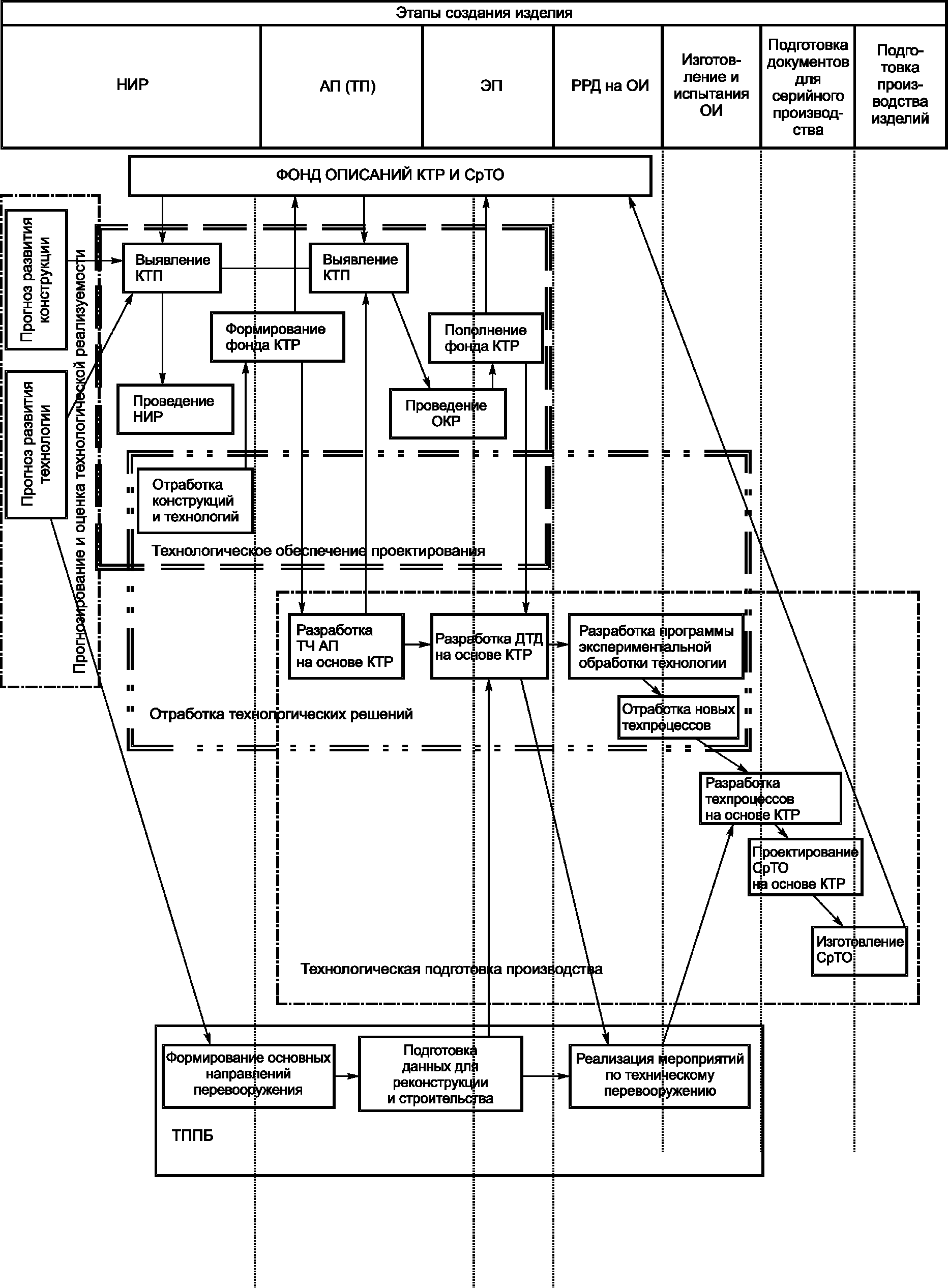 4.1 Система технологического обеспечения разработки и постановки на производство изделий является частью организационно-технической системы, предусматривающей создание и реализацию единого эффективного механизма технологического обеспечения цикла "исследование-разработка-производство", направленного на сокращение сроков проектирования и изготовления технологичных изделий требуемого уровня качества и надежности в условиях постоянного повышения сложности и быстрой сменяемости новых поколений КТ.