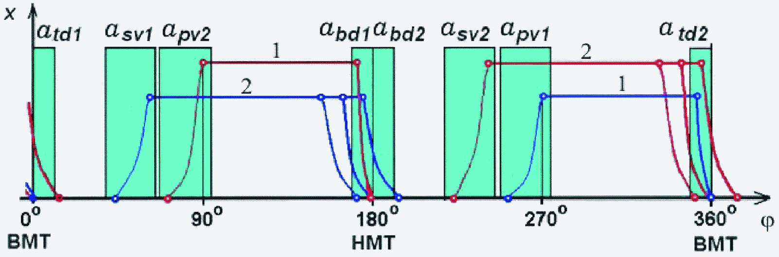 На рисунке 1 показана циклограмма работы поршневого компрессора в виде зависимости высоты поднятия x запирающих органов (пластин) клапанов от фазы