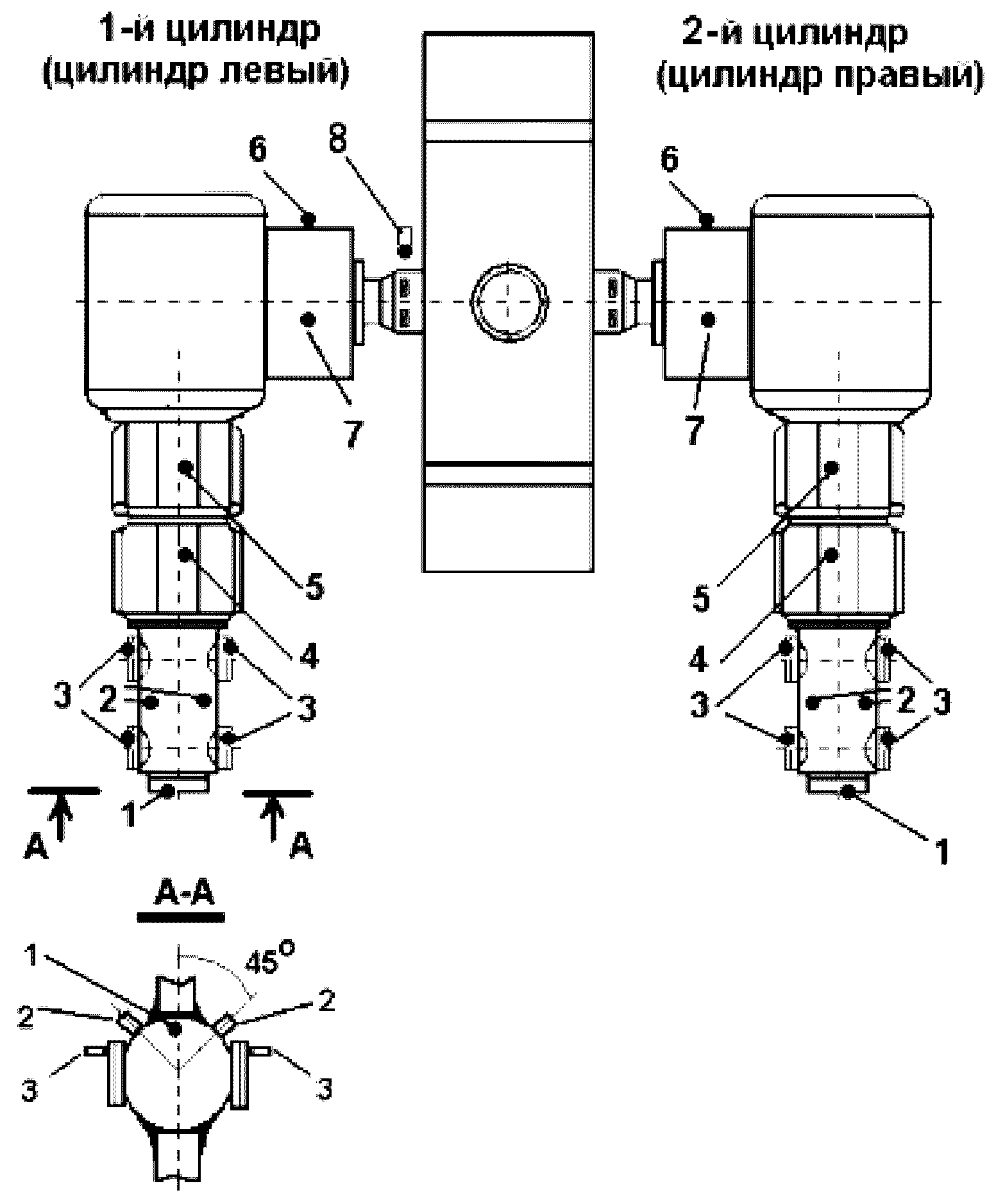 В.2 показаны рекомендуемые места установки датчиков на оппозитном и двухрядном компрессорах.