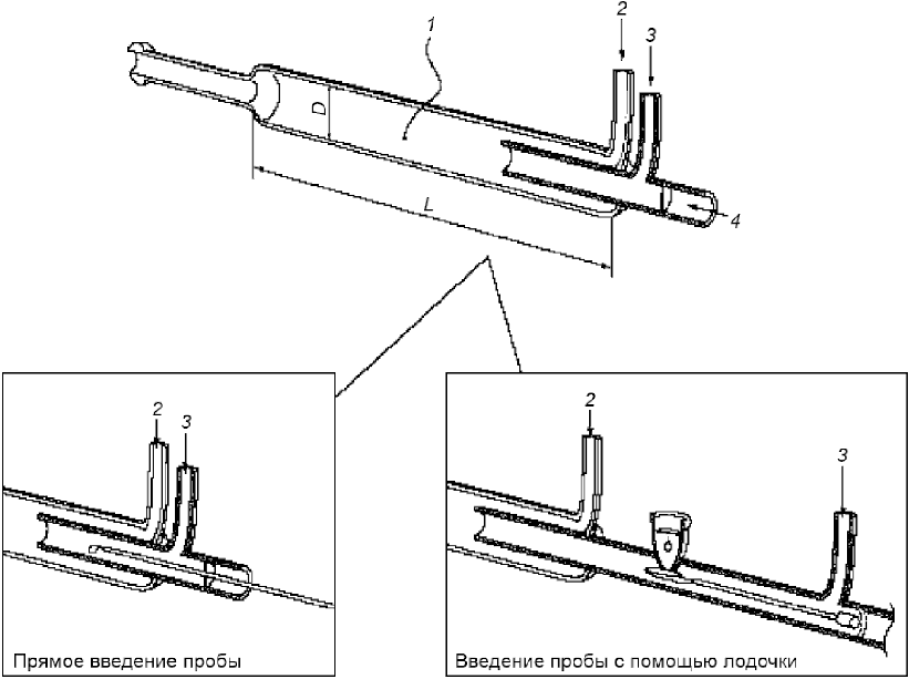 Удлиненная трубка для сжигания должна обеспечивать герметизацию входа в область окисления и поток газа-носителя. Система ввода должна обеспечивать механическую подачу и удаление образца (лодочки) из печи. Используемый механизм должен обеспечивать размещение лодочки в самой горячей зоне печи. Лодочка для образца и трубка для сжигания должны быть изготовлены из кварцевого стекла. Трубку для сжигания оснащают охлаждающей рубашкой в области, в которую удаляют лодочку для введения пробы из микрошприца. Следует использовать механизм, обеспечивающий подачу лодочки с образцом в печь и ее удаление из печи с контролируемой и воспроизводимой скоростью (см.