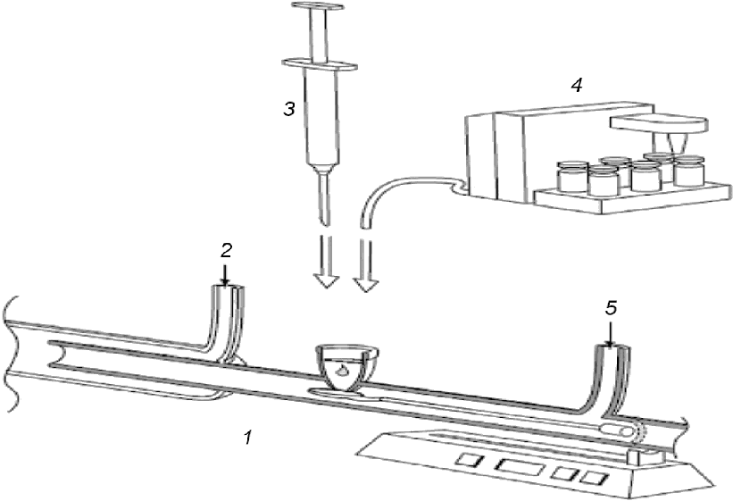 шприца; 3 - подача кислорода; 4 - подача газа-носителя